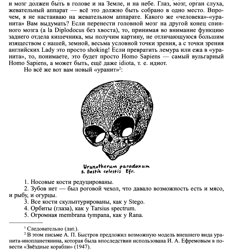 Иногда исследование обстоятельств появления на свет литературного произведения приводит к неожиданным результатам. Так, незначительная повестушка "Звёздные корабли" после моих биографических изысканий вдруг засияла уже в ином свете. Произведение это не пользуется большой популярностью: оно и понятно, это вещь была написана для своих, и ради своих. Военные годы, в эвакуации Ефремов изнывает от тоски, болезни и привнесенного ею страха смерти, а также от разлуки с друзьями. Экстраверт Ефремов не мог бы пожаловаться на недостаток общения, однако подлинных единомышленников у него крайне мало. Одним из них был анатом и палеонтолог А. П. Быстров, эвакуированный в Вятку (Киров), где его пристроили преподавателям в Венно-медицинскую академию. В провинциальной глуши Быстров быстро закис, и хоть продолжил заниматься наукой, но постепенно утратил остроту ума и стал впадать в депрессию, которую усугубляло тяжелое заболевание, как и у Ефремова. Но ситуация у Быстрова была хуже, поскольку, оторванный от академической жизни столицы, в Кирове о чувствовал себя одиноко, с нескрываемым презрением говоря в письмам о местных кировских интеллектуалах. Еще в переписке он называл Ефремова своим единственным другом и сетовал на то, что Антоныч пренебрежительно относится к его проблемам. Напрасно. Ефремов близко к сердцу принял упадок своего друга, настолько, что даже приспособил его к оному из своих рассказов о необыкновенном, выписав Быстрова под именем Шатрова как одно из главных действующих лиц.