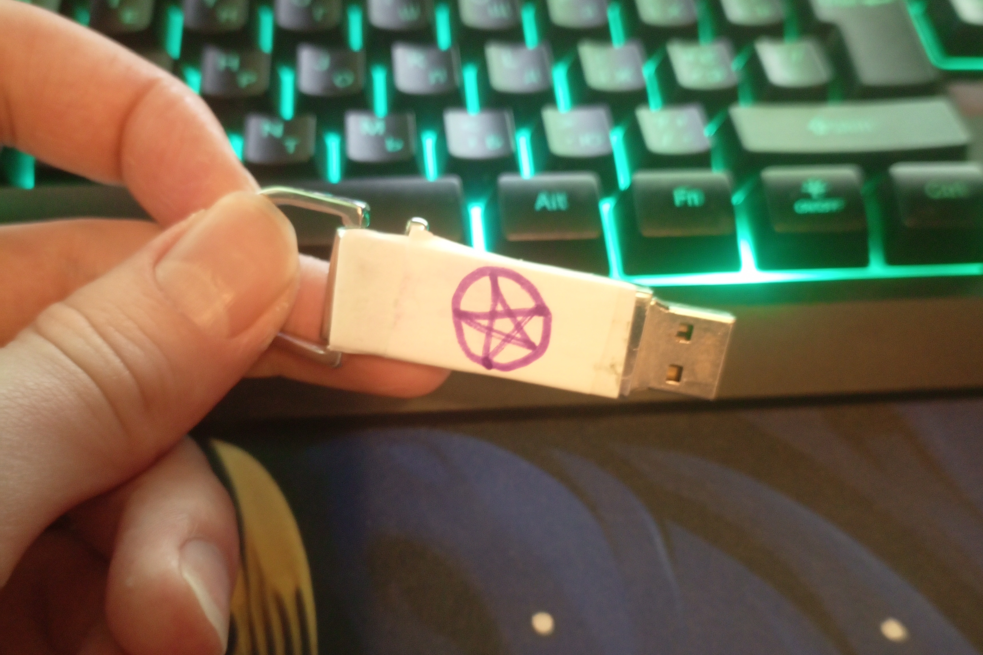 Привет, /сн/ач. Нашёл на улице флешку недалеко от дома 32к2, проспект Просвещения, Питер. На ней не звезда давида кстати, а пентаграмма, лежала просто на земле, заметил чисто из-за фиолетового цвета
