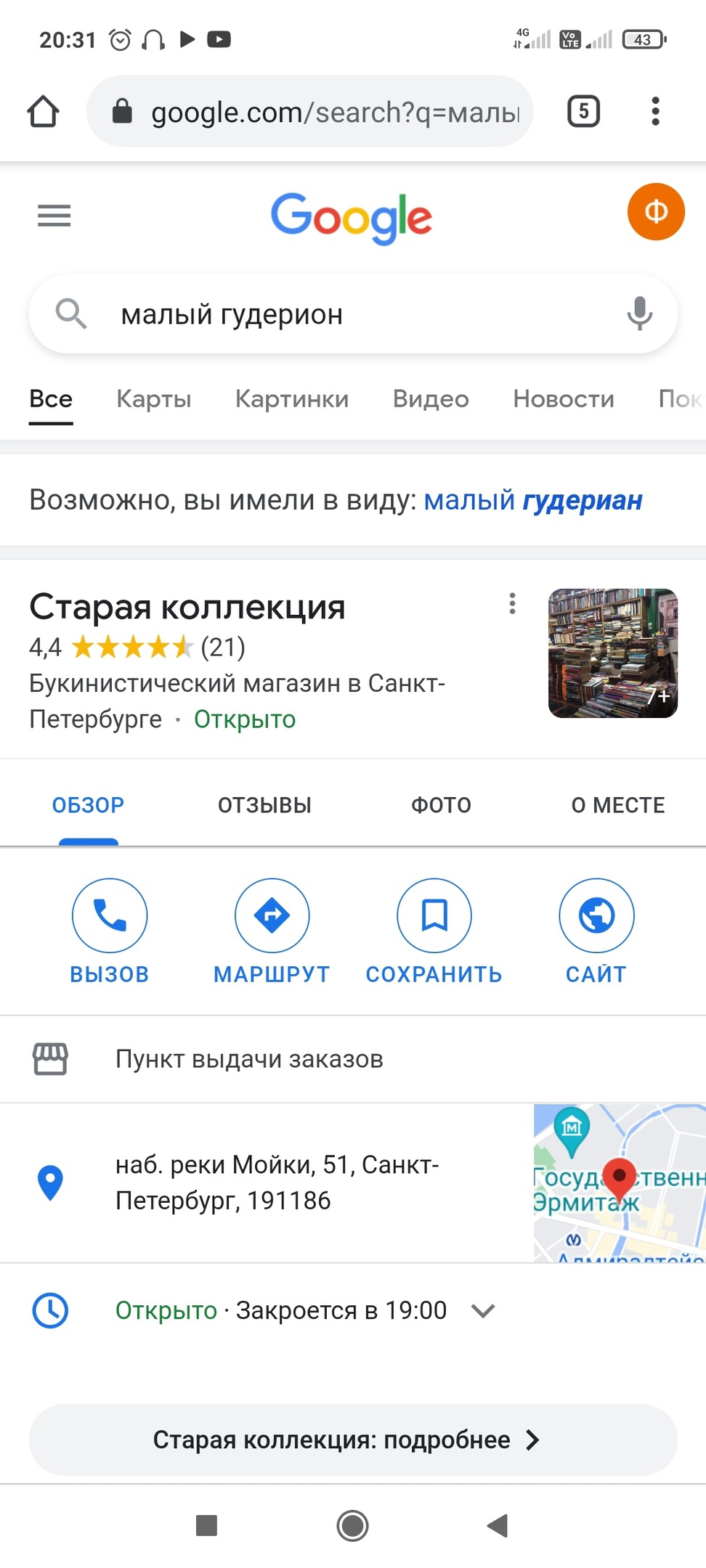 Истории несколько лет, паранормального в ней как будто бы особо и нет, но зато она полностью правдивая. Было это четыре года назад, также в июле. Ночевал я тогда на даче, и вот снится мне следующий сон: Иду я по одному из знакомых городских дворов, дохожу до угла, а там два чувака хвастаются друг перед другом своими попугаями, зелёным и серым. Метафоры тут нет, у них на плечах буквально сидело по попугаю. Я стоял рядом, в руках у меня был листок-стикерпак с какими-то очень старыми наклейками. Не помню что именно на них было, но важен сам факт наличия. Чувак с серым попугаем посмотрел на него и сказал: зайди в малый гудерион и быстро скажи "продам за 20 тысяч", может что-нибудь получишь. На том сон и завершился. Я сны вообще очень редко запоминаю, если это не какой-нибудь кошмар, но тут слово "Малый Гудерион" прям в голову въелось. Загуглил - гугл выдал магазин в центре Питера, торгующий всяким старьём. Самое необычное было то, что ни в названии магазина, ни где-то на картах рядом ничего с названием "Малый Гудерион" я не нашёл. Стало настолько интересно, что даже заскринил, отправил тогда товарищу вместе с самой историей. Скрин прилагаю. Посколько в вещие сны не верю, то довольно быстро про это забыл. Прошло полгода, я переезжал в квартиру, которая до этого принадлежала моей прабабушке, и в течение нескольких дней мы с сестрой и матерью разбирали старые вещи. Тогда же я и нашёл старый пожелтевший стикерпак. Кажется, были там крошечные рисунки навроде тех, что изображают на марках. Отложил его в сторону, а спустя некоторое время выяснилось, что мать кинула листок к остальному мусору и в итоге стикерпак этот утерян навсегда. Было мне обидно чуть-чуть, но сильно я не переживал. Историю просто забыл.