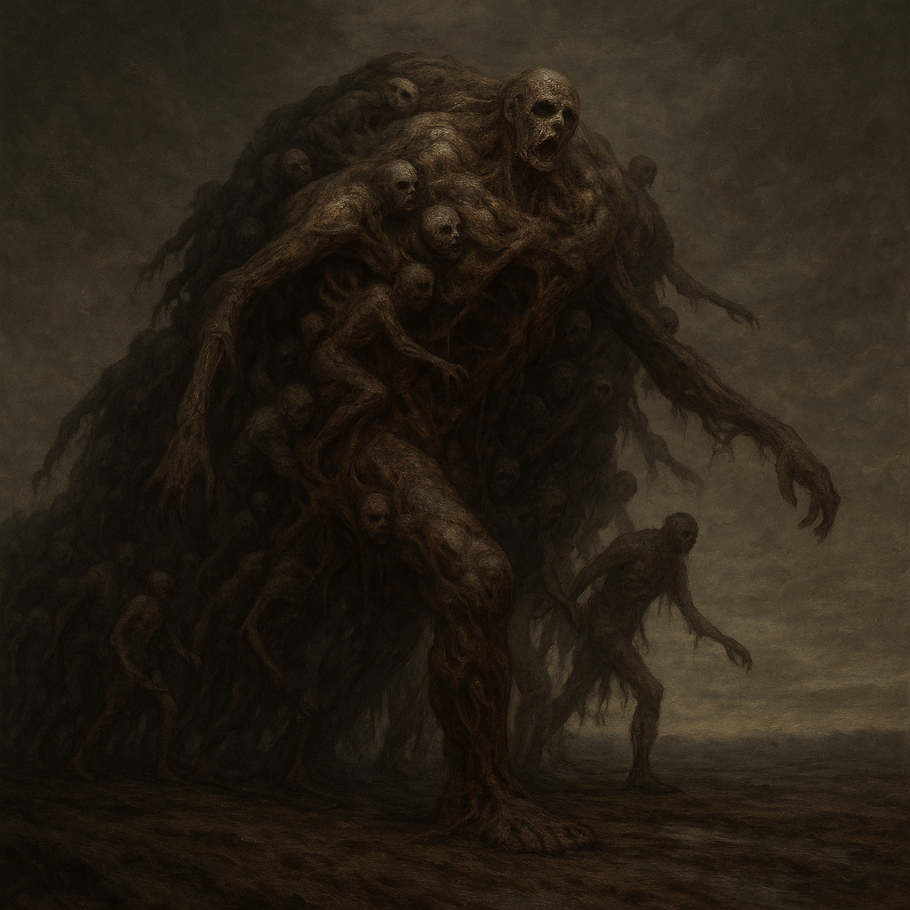 Я не знаю, как начать. У меня нет ни доказательств, ни слов, которые могли бы объяснить это… существо. Но если вы услышите шаги — ровные, медленные, будто кто-то меряет землю — бегите. Не оглядывайтесь. Я работал тогда недалеко от бывшей деревни, что давно стерта с карт. Сначала всё было тихо — слишком тихо. Даже ветер не шелохнул траву. Птицы молчали. А потом я заметил, как земля… дрожит. Едва заметно, будто внутри что-то ворочается. Показалось. Так я подумал. Но на следующий день я увидел его. Оно не шло — оно двигалось собой. Целиком. Гора из тел, связанных, вросших друг в друга. Не зомби, не монстр. Больше похоже на памятник, что сбросили с пьедестала, и он пополз. Тела не были мёртвыми — точнее, не совсем. Они были использованы. Как кирпичи, как мясо для чего-то большего. Лица — сотни лиц — глядели во все стороны. Некоторые двигались, как будто пытались говорить. Другие просто смотрели. На меня. Я застыл. А оно всё шло. Медленно, но безостановочно. Я видел, как внизу его плоть расползается, сливается с землёй. Там, где тело рвалось — наружу вылезало новое. Иногда не целиком — только рука, нога, половина головы. Оно не страдало. Оно заменяло себя. И шов у него — это не шрам, это сплетённые кости. Не человеческие. Я видел позвоночник, в который встроен младенец. Просто как элемент конструкции. Как замок в стене. А рядом — лицо в военной каске. Я узнал его. Это был мой брат. Погиб десять лет назад. Я похоронил его сам. Он смотрел, не двигаясь, но я чувствовал — он знал меня. Оно знало. Я слышал шаги ещё до того, как увидел его. Тихие, как биение сердца земли. Потом всё громче. Сначала во сне. Потом наяву. Этот ритм… нельзя забыть. Как метроном для мертвецов. Я убежал тогда. Спотыкался, выл, плевался грязью. Когда обернулся — ничего не было. Ни следов, ни запаха. Только ощущение, что оно всё ещё где-то рядом. И не стоит на месте. Оно не разрушает — оно движется, поглощает, вбирает. Всё, что встречает. И я боюсь, что однажды оно придёт туда, где живут люди. Не для того, чтобы убивать. А чтобы продолжить путь. Я не знаю, как это остановить. Может быть, никак.
