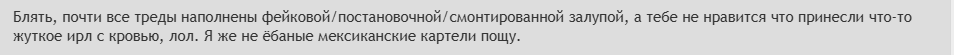 Блять, почти все треды наполнены фейковой/постановочной/смонтированной залупой, а тебе не нравится что принесли что-то жуткое ирл с кровью, лол. Я же не ёбаные мексиканские картели пощу.
