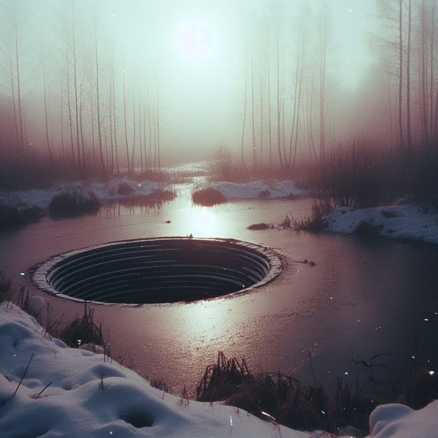 Снилась очень жидкая и реденькая лесополоса, я бы даже сказал тундра. Серая, мертвая, вокруг только кусты, трава и сухие низкие деревца. Все в дымке и слегка припорошено инеем. Солнце если и было, то не видел. И посреди всего этого - болотце. С виду мелочь: диаметр не больше десятка метров, ну лужица, обойди вокруг и все. Но вода абсолютно черная и маслянистая, будто дыра в никуда.