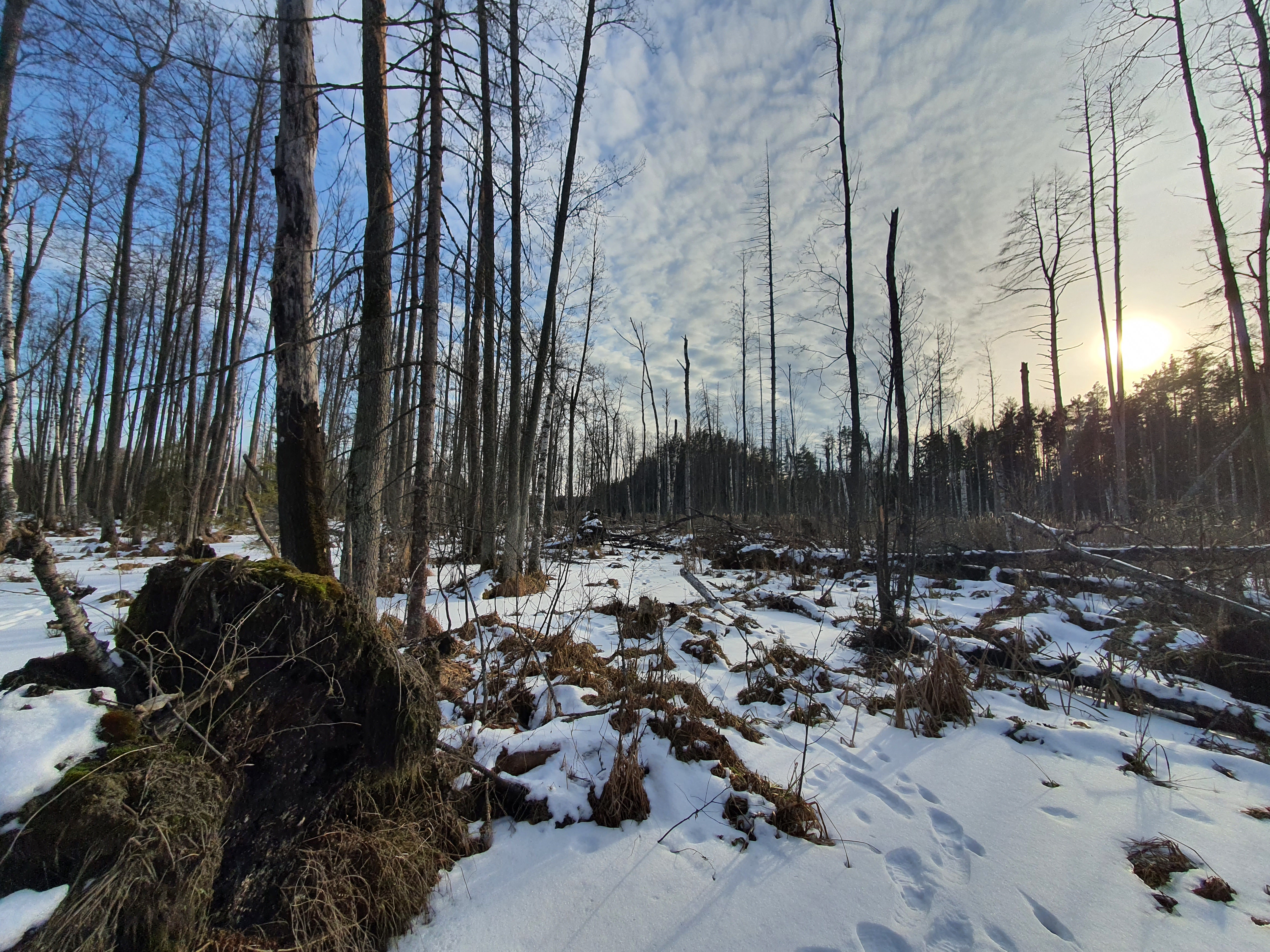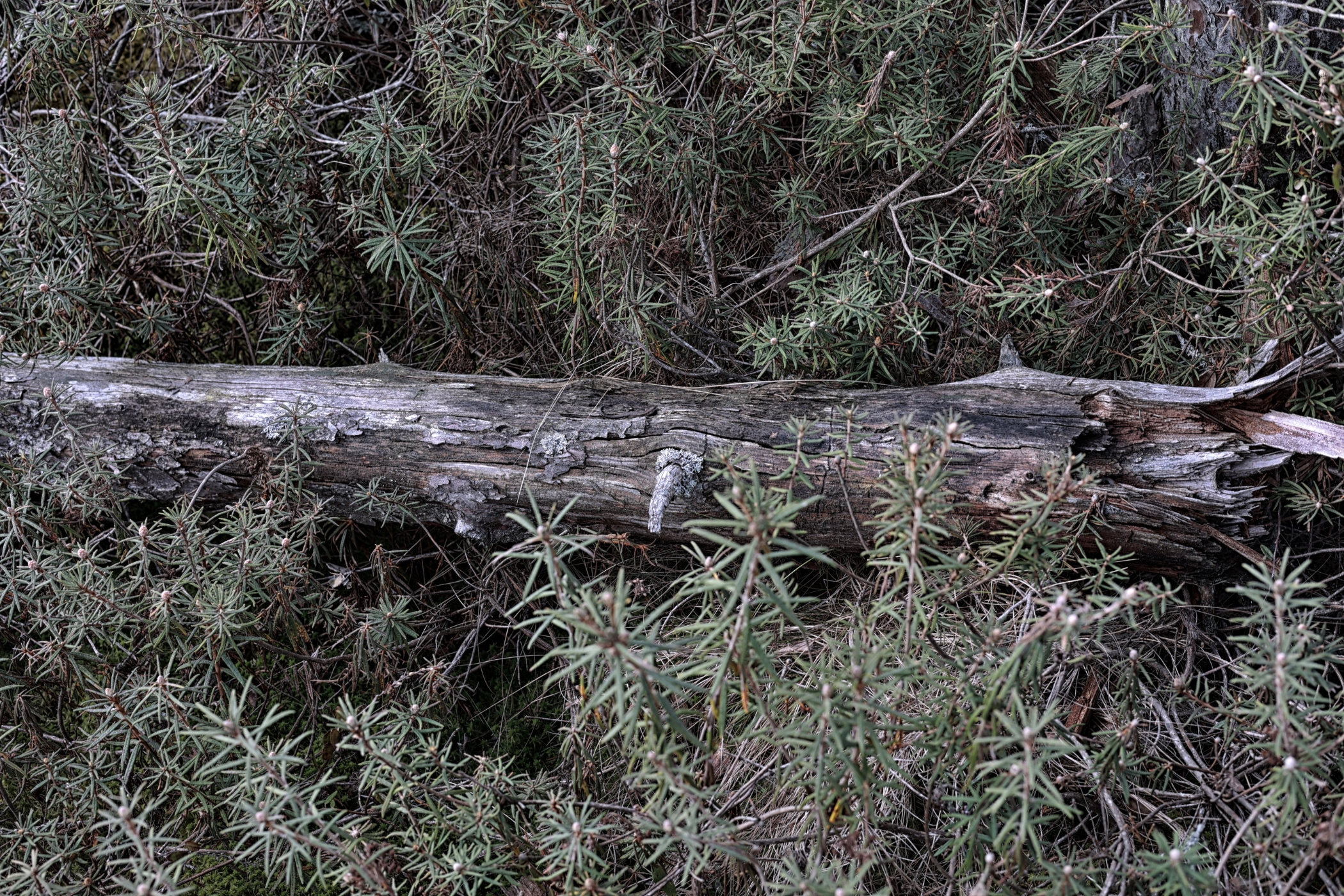 Выхожу к более "свежей" разработке торфяной - она не поросла мелким лесом как та по которой я путешествовал, а просто представляет собой топь поросшую молодыми деревцами и травами. Начинает темнеть. Впереди снова лесок, ныряю туда - и офигеваю с того как камера щелкает затвором медленно - там почему-то пиздец темень, хотя сумерки пока только начинаются. Снова покореженные деревья, и вот оно - следы механизмов.