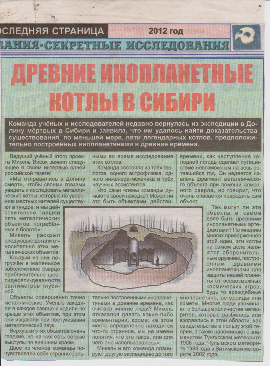 "Первый раз в 1933 году, когда мне еще было 10 лет - вместе с отцом ездил на заработки. Потом в 1939 году - уже без отца. И последний раз - в 1949 в составе группы молодых ребят. "Долина смерти" тянется вдоль правого притока реки Вилюй. По сути - это целая цепочка долин вдоль его поймы. Все три раза я был там с проводником якутом. Шли мы туда не от хорошей жизни, а оттого, что там, в этой глуши, можно было мыть золото, не ожидая в конце сезона ограбления и пули в затылок. Что касается таинственных объектов, их там наверное много, потому что за три сезона я видел семь таких "котлов". Все они представляются мне совершенно загадочными: во-первых, размер - от шести до девяти метров в диаметре. Во-вторых, изготовлены из непонятного металла. Дело в том, что "котлы" не берет даже отточенное зубило (пробовали, и не раз). Металл не отламывается и не куется. Даже на стали молоток обязательно оставил бы заметные вмятины. А этот металл сверху покрыт еще слоем неизвестного материала, похожего на наждак. Но это не окисная пленка и не накипь - ее тоже ни сколоть, ни процарапать. Уходящих вглубь земли колодцев с комнатами, о которых говорится в местных легендах, мы не встречали.
