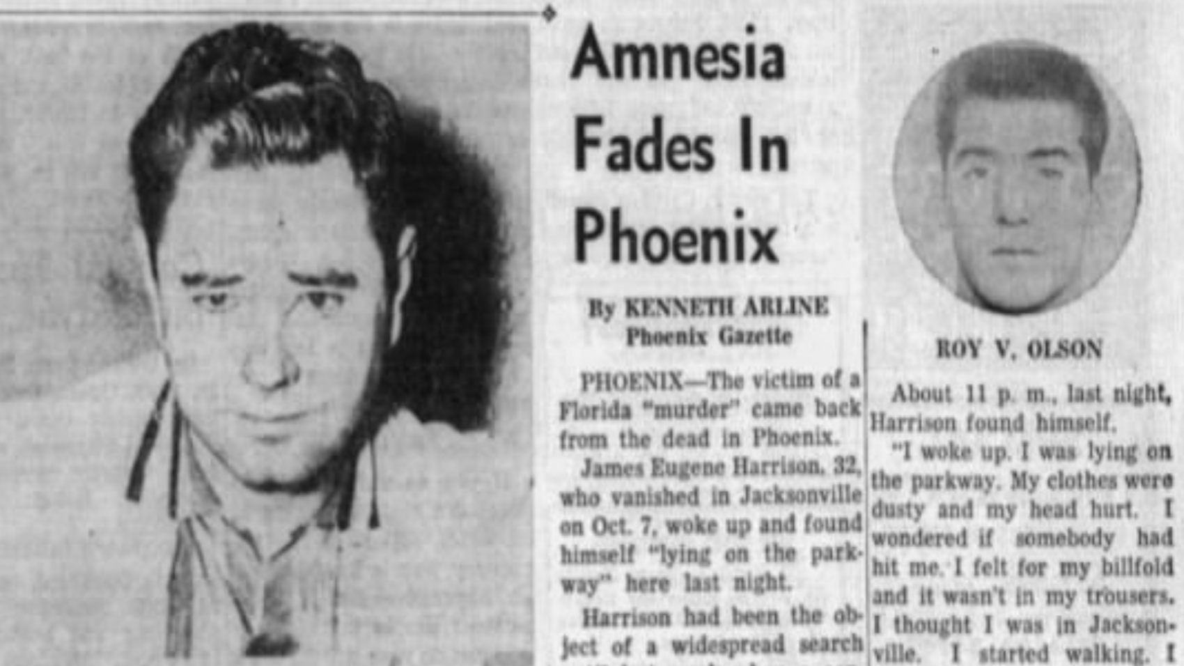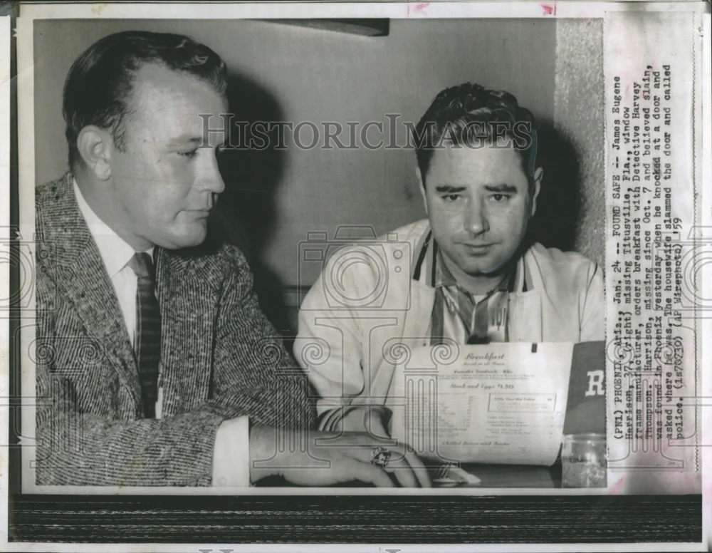 Джеймс Юджин Харрисон - успешный бизнесмен (владелец оконного бизнеса - не вставлял, а производил), семьянин, отец двух детей. Покойному было 32 года. 7 сентября 1958 года он отправился в рабочую поездку в Коко Бич, штат Флорида(2, см. карту), всего в 15 милях (примерно 24 километра) от его дома в Индиан Ривер Сити, снова Флорида(1). Когда он не вернулся домой к вечеру, его жена Джин забила тревогу и позвонила в полицию. В полиции только развели руками и пообещали разобраться. Разводили руками там целую неделю, пока машину Харрисона не обнаружили в Джексонвилле, ну вы понели, все еще штат Флорида(3), примерно в 150 милях (241 километр) от дома. Машина была брошена на следующий день, после исчезновения Харрисона, переднее сиденье было залито кровью настолько, что полиция решила что здесь точно произошло убийство. Группа крови совпала с группой крови Харрисона, единственные отпечатки пальцев в машине принадлежали тоже ему. Рабочей версией полиции было нападение случайного попутчика, который убил и ограбил Харрисона, закопал тело и бросил автомобиль. Джин Харрисон пришлось продать его оконный бизнес и переехать жить к его матери в Майами. Все это время она ждала хоть каких-либо дальнейших вестей о предположительно убитом муже. 18 января 1959 года Рой Виктор Олсон, отбывающий срок в Калифорнии за убийство местного телеведущего Огдена Майлза, сознался в убийстве Харрисона. По его словам, в Сиэттле Олсон убил ресторатора Джона Вайлера , затем убил Майлза в Калифорнии (оба убийства носили следы «половых извращений»), после чего отправился во Флориду, где встретился с Джеймсом Личем, с которым путешествовал на попутках несколько дней. Согласно его версии, 7 сентября 1958 года Харрисон подобрал Олсона и Лича на трассе 90 между Лейк Сити(4) и Джексонвиллем (!). Решив, что он был при деньгах, во время остановки они его убили (Олсон бил ножом, Лич стоял с камнем в руке наготове). Тело они закопали, взяв лопату в машине, там же они нашли два мешка (Олсон думал, что это известь), содержимым которых засыпали тело. Их добычей стали 500 долларов. Бросив машину в Джексонвилле, сообщники расстались. По словам Олсона, полиция должна была найти Лича довольно легко – он был обильно покрыт татуировками. Полиция подтвердила, что у Харрисона в машине всегда была лопата, а перед самым исчезновением он купил два мешка удобрений. Два пустых мешка из-под удобрений были найдены в примерном месте захоронения, на которое указал Олсон, само тело найдено не было. Олсона этапировали из Калифорнии во Флориду, а ФБР выписало ордер на арест Джеймса Лича. 23 января татуированный Лич был задержан в Ноксвилле, штат Теннесси. В отличие от хладнокровного убийцы Олсона, двадцатиоднолетний Лич до этого привлекался только за бродяжничество. Он подтвердил, что они с Олсоном несколько дней вместе путешествовали автостопом, но категорически отрицал свое участие в убийстве. Он не понимал, почему Олсон придумал всю эту историю и выставил его соучастником. Как легко догадаться, в полиции ему не поверили. Полицейские потирали руки и поздравляли друг друга с быстрым раскрытием дела. 23 января, в день ареста Джеймса Лича, в Фениксе, штат Аризона (на другом конце страны), автомобиль, отъезжающий от дома в обычном жилом районе, был остановлен незнакомцем. Он попросил отвезти его в полицейский участок, водитель отказал, но п
