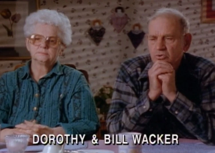 Билл(р. 1920) и Дороти(р. 1927) Уэкер, обычная семейная пара из города Массиллон, штат Огайо. Они вели обычную спокойную и непримечательную жизнь, пока 16 января 1985 года они не обратились в полицию, т.к. кто-то пробрался в их дом, пока их не было. Оказалось, что годом ранее они уже два раза подвергались подобным грабежам, но в полицию не сообщали. Ничего существенного украдено не было, полиция развела руками, тихая жизнь вернулась в свое русло. В июле 1985 года, когда Дороти была дома одна(она недавно перенесла операцию на сердце), в дверь постучали. На пороге был молодой человек, который попросил помощи, т.к. его машина сломалась. Дороти пустила его внутрь позвонить. Она оставила его одного, вскоре услышала, как он с ней попрощался и решила, что он ушел. Внезапно кто-то стукнул ее сзади по голове. В себя она пришла связанной на полу. Дороти проползла к открытому окну на кухне и позвала на помощь. Дороти смогла описать нападавшего полиции: молодой человек за двадцать, среднего роста, блондин с голубыми глазами. По ее описанию составили фоторобот(см. пик). Билл сообщил, что из дома было похищены старинные часы, револьвер .22 калибра, видеокамера и рация. В кухне на стене карандашом было нацарапано Cheaper, but will do. Полиция прошерстила все местные ломбарды и скупщиков, но не нашли следов похищенного. В последующие месяцы Уэкеров продолжали доебывать неизвестные. Сначала телефонными звонками(угрожали или просто дышали в трубку), затем начали стучать в стены дома ночью. Билл поставил автоматические фонари, но так и не смог поймать злоумышленников, утром на стене дома было накорябано Your lightz are a laugh(!). Кроме этого, под дверь им продолжали подкидывать записки. Копы не нашли на них отпечатков пальцев, а, взглянув на почерк, предположили, что записки были написаны не доминантной рукой, чтобы скрыть настоящий почерк. В ноябре Билл, вместо привычных записок, обнаружил под входной дверью свой револьвер. Постепенно, все похищенное было возвращено. Полиция не нашла на вещах отпечатков пальцев и снова развела руками. Подобная травля со звонками и стуками по ночам продолжалась ГОДАМИ. Наконец, 27 октября 1993 года на Дороти снова напали и она загремела в больницу с сотрясением и травмой головы. В ноябре Билл отрастил яйца и, вместе с родственниками, организовал облаву. Они просидели всю ночь вокруг дома, переговариваясь по рациям, но никого не заметили. Следующей ночью стук снова повторился, под дверью Билл нашел еще одну записку - Get the message. После этого травля прекратилась. 25 мая 1994 года дело семейки освятила дорогая передача Unsolved Mysteries. Ответов Уэкеры и полиция так и не получили. Билл умер в 1999 году, Дороти в 2010. Кто и зачем занимался травлей стариков на протяжении 9 лет?