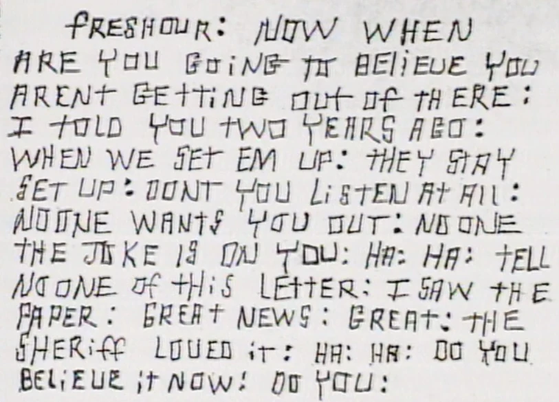 Серклвилль – небольшой городок в штате Огайо, жители которого в 70-ых годах начали получать анонимные письма, автор которых угрожал обнародовать различные нелицеприятные тайны этих жителей. Одной из главных и первых жертв стала водитель школьного автобуса Мэри Гиллиспи. Автор утверждал, что знает о ее любовной связи со школьным суперинтендатом Гордоном Мэсси (Мэри подобные слухи отвергала), что он следил за ее домом и знает, что у нее есть муж и дети. Мэри получила еще пару подобных писем, но скрывала их от других. Сами письма были написаны большими квадратными буквами, надо полагать, чтобы скрыть настоящий почерк, были в конвертах без обратного адреса, но проштампованы в Коламбусе, Огайо (в сорока километрах от Серклвилля). Вскоре письмо получил муж Мэри – Рон, в котором автор угрожал Рону, если он не прекратит измены своей жены и не заставит ее признаться в содеянном. Автор заявлял, что если не будут приняты меры, то он раструбит об изменах на весь город – будет использовать радио, тв и рекламные щиты. Мэри о Рон рассказали о письмах сестре Рона Кэрен, ее мужу Полу Фрешауру и сестре Пола. Вскоре к письмам добавились телефонные звонки и расклеенные по городу листовки, в которых, в числе прочего, были подъебки к дочерям Мэри. Сам суперинтедант получил письмо 3 марта 1977 года, в котором автор призывал его сознаться во всем школьному совету. Школьный совет получил подобное письмо на следующий день. Мэри с самого начала подозревала, что автором писем являлся ее коллега Дэвид Лонгберри, который оказывал ей знаки внимания. Вся семья собралась и написала ему письмо, в котором призывали его остановиться, т.к. они знают, что он является автором. Несколько недель новых писем не было, поэтому они решили, что правильно установили авторство и успокоились. Вечером 19 августа 1977 года Рон ответил на телефонный звонок. От звонка он пришел в ярость, схватил ствол, сказал дочери, что звонок был от автора письма, запрыгнул в пикап и уехал. В 22:35 его автомобиль нашли впечатанным в дерево, а сам Рон был найден мертвым за рулем. Из его пистолета, который валялся на полу пикапа незадолго перед смертью, был сделан один выстрел. Пол Фрешаур настаивал, что это было убийство – даже писал прошения в ФБР. Шериф Дуайт Редклифф сначала расследовал смерть как убийство – был даже задержан и допрошен подозреваемый (его имя не называлось), но после того, как подозреваемый прошел тест на полиграфе (ну-ну) и патологоанатом Рэй Кэролл нашел в крови Рона алкоголь в два раза превышающий допустимое значение, то смерть посчитали несчастным случаем и дело закрыли. После этого автор писем пошел вразнос – письма стали получать остальные жители города, в которых автор обещал обнародовать различные их прегрешения, о которых он каким-то образом был осведомлен. В письмах он критиковал и шерифа Редклиффа, утверждая, что он намеренно замял смерть Рона, а доктора Кэролла уличал в педофилии. После смерти Рона, Мэри сблизилась с Мэсси, в любовной связи с которым ее уличали письма. Письма продолжались, стали еще более жесткими и агрессивными. 7 февраля 1983 года Мэри следовала по обычному автобусному маршруту, когда увидела очередной плакат от автора писем, на котором были написаны похабности про ее двенадцатилетнюю дочурку (что она состоит в сексуальных отношениях с Мэсси). Она остановила автобу
