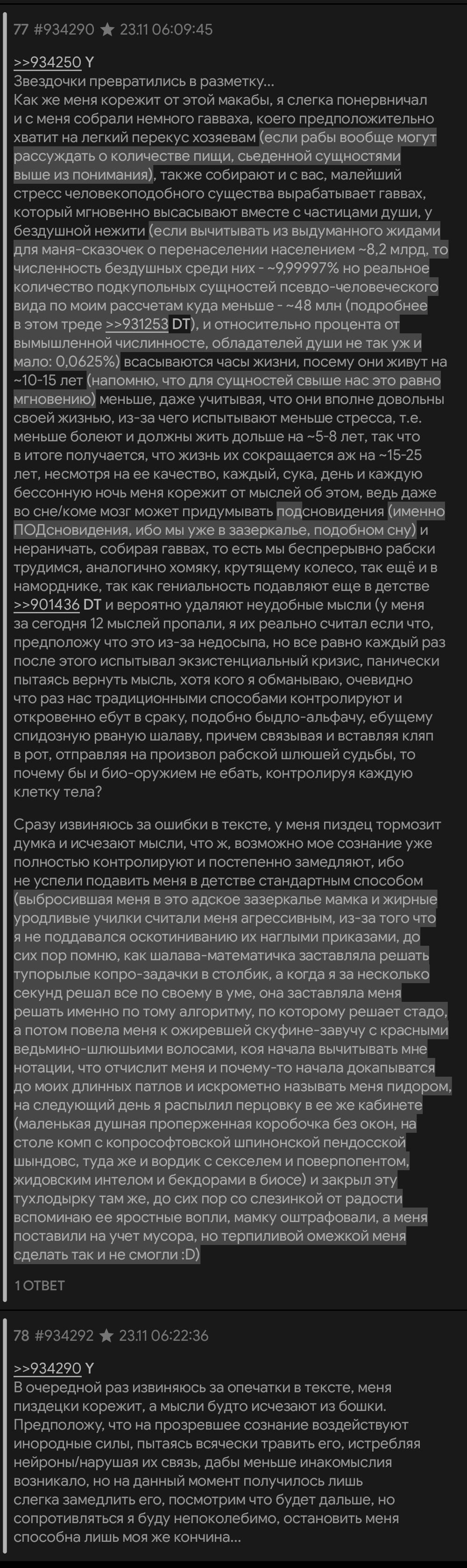Здорова, сначеры. Почему-то, начиная с 2016 года, начал замечать, как увеличилось количество шизов в сети. Начали попадаться на глаза шизофазические комменты там, где их не должно было бы быть в принципе (комментарии к фильмам, играм, даже мультфильмам на онлайн-сайтах, на торрент-трекерах, в тематических группах ВК, причем даже в очень маленьких). Также шизов стали специально раскручивать довольно крупные паблики ВК, такие как Деградат нация (ныне ватная помойка, но раньше там попадались довольно годные вещи), специально созданный для этих целей паблик Поехавшие страницы ВК, который за короткое время набрал обширную аудиторию. Причем повторяю, до 2016 года я НЕ встречал в интернете ничего подобного, хотя сидел там очень плотно и активно серфил по разным закоулкам сети. Примерно с того же времени начались форсы Тихого дома, Синих китов, 4:20 и прочей околошизы. Так вот, вопрос: для чего все это делается? Может быть реально людей хотят свести с ума, подменяя нормальную реальность извращенно-больной? И ведь количество больных действительно увеличилось ИРЛ, даже в маленьких городках типа моего постоянно случаются какие-то нападения людей друг на друга на ровном месте, поножовщина, изнасилования. Все эти квадробобры, редановцы и тому подобная срань не просто так появилась. Кто что думает, аноны?