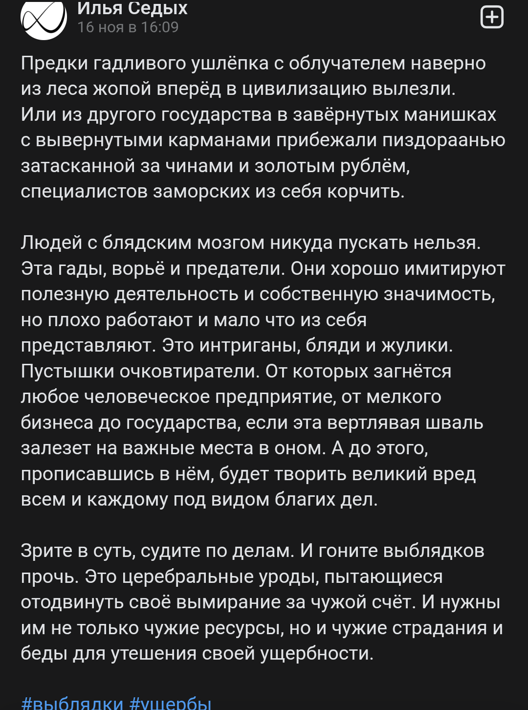 Ой, опять начинается левацкая повесточка как в "старых-добрых" 2010х. Тогда тоже было полно нитакусек с перекрашеными волосами или без, которым чудились голоса, и они мнили себя "илиткой с биполярочкой и за всё хорошее, против всего плохого, никак у этих токсичных нормисов". Только вот ничего кроме своей шизы и изредка псевдоинтеллектуальных цитаток и говноартов не могли предложить. И масло в огонь их шизе подливали всяческие гейткипоры, ага. Хорошо что вовремя срыгнул с этого балагана с радужно-соевым лимбо под маской "жизни". Но куда деваться было в силу возраста и отсутствия жизненного опыта и развитых мозгов...