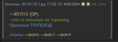>>862820 (OP) укоход-тред фрагменты разговоров, допросов, радиоперехватов и случайных записей ⸻ …сначала подумал — ветер. Потом понял: нет, это он. Ползёт. Огромный. Земля шевелится, будто холм дышит. Но это не холм. Это жопы. Сотни жоп. Они слились в одно и тянут тушу вперёд. Оно шло. И пёрло. ⸻ …у него не ноги. Колонны из тел, обмотанные кишками. Жопы шевелятся, пукают, но не говорят. Руки цепляются за воздух, будто просят пощады. А в центре — огромное что-то, как сердце, но с лицами. Лица смотрят. Тоже страдают. ⸻ …сняли с дрона: движется медленно, но без остановки. Вся масса подрагивает, будто оно дышит… или газует. На кадрах видно: нижние тела истираются об землю, взрываются пуксами, а новые вылезают изнутри. Само себя обновляет. ⸻ …никаких криков. Только хлюпанье и… пердеж. Ни одна птица не поёт. Лес слушает, как оно идёт. И пёрдит. ⸻ …ночью не спал. Слышал эти шаги. Не как у людей. Тяжёлые, со свистом. Будто кто-то волочит что-то огромное и срывает газы на ходу. Потом — тишина. А утром — в земле ямы. И в каждой — запах. Такой, что глаза режет. ⸻ …пахнет сыростью, металлом, старой кровью… и отвратным пуканием. Как будто оно собирает всё. И запахи тоже. Всё шито-перешито — костями, кишками, жопами. Всё едино. Всё пердит. ⸻ …я не понимаю, как оно держится. Оно не живое. Но оно хочет идти. И пёрдеть. Это желание видно. И слышно. ⸻ …подошёл ближе. Не знаю зачем. Чувство, что звал меня. Узнал лицо. Среди жоп. Это был мой брат. Он умер десять лет назад. Но он был там. И пёрнул. Как будто сказал: "Иди за мной". ⸻ …оно не убивает. Оно зовёт. Не голосом — пуком. Сначала тихо. Потом громче. И уже невозможно игнорировать. ⸻ …если оно дойдёт до города — не знаю, что будет. Оно всё собирает. Камень, плоть, дерево… и газы. Всё становится им. Пукоходом. ⸻ …самое страшное — не вид. Самое страшное — это ритм. Шаг — пук. Шаг — пук. Метроном пердежа. В этом ритме есть что-то древнее. Как будто сама земля помнит этот звук. ⸻ …я видел младенца. Труп младенца. Встроен в позвоночник. И он тоже пёрнул. Смотрел прямо в меня. И я понял: оно меня помнит. ⸻ …шаг — скрежет. Шаг — хлюп. Шаг — пук. Потом снова. Снова. Снова. ⸻ …и даже если вы сожжёте его — оно всползёт. Из почвы. Из тел. Из пердежа. Это не чудовище. Это путь. Путь, который идёт. И пёрдит. Пока есть куда.