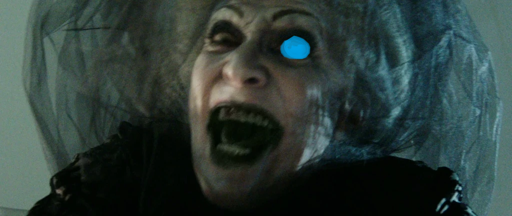 Тетка резко превращается в ведьму из фильма "Астрал", хватает шприц с краской и бросается на меня. Она очень сильная, у нее едва не получается сделать мне укол в шею, даже царапает кожу иглой. Но я с большими усилиями перехватываю ее руку и вкалываю краску ей в глаз, он постепенно становится голубым.