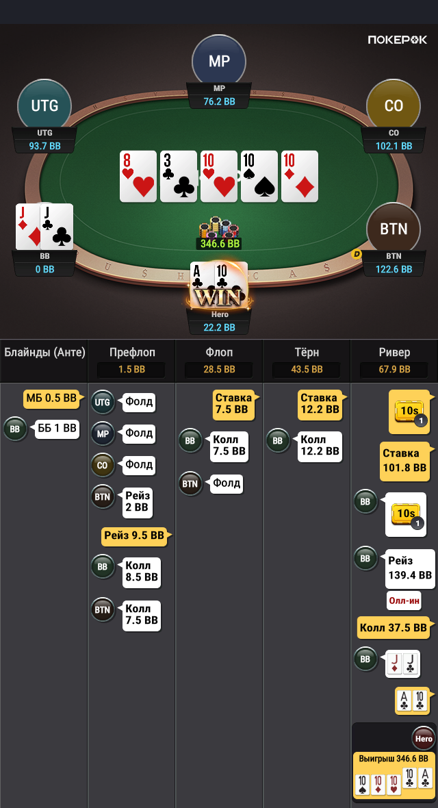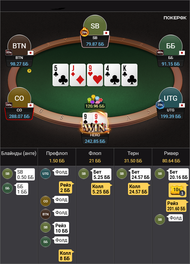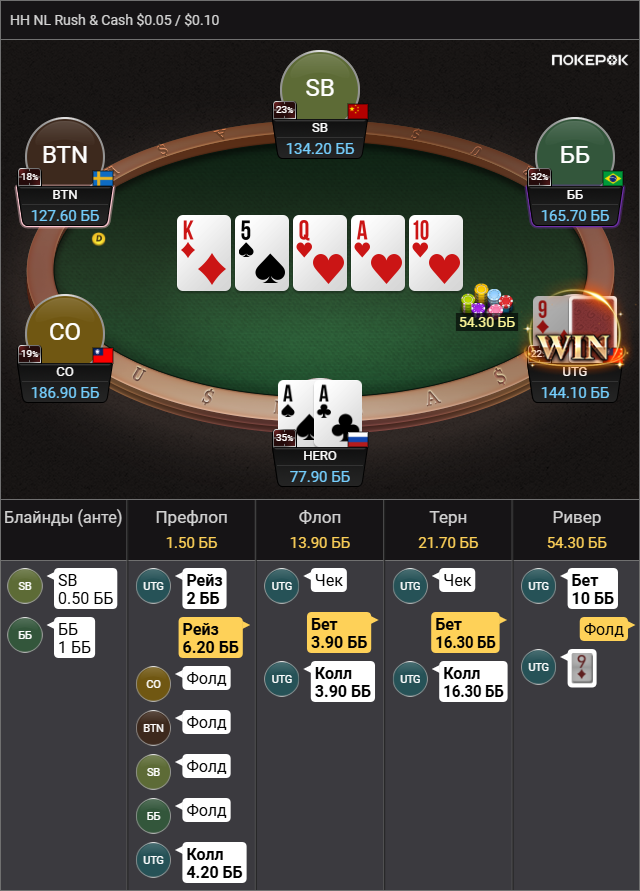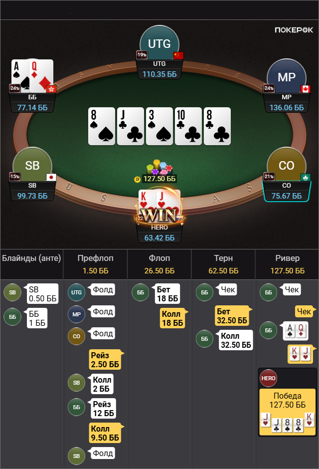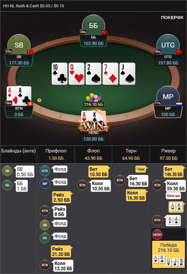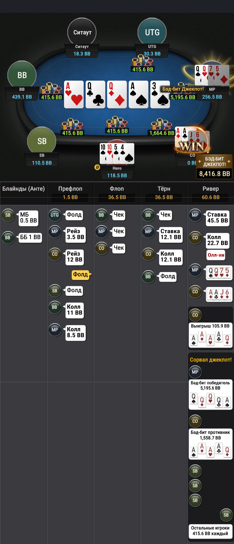 Выбивает все мои TT-KK, которые дают бедбит джекпот, проплачивает миллиард карет, ведь в мультипоте в колесо флопом я вполне могу ренжчекать и все тузы у меня будут. Браво маэстро.