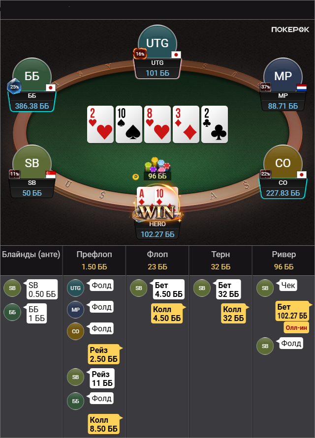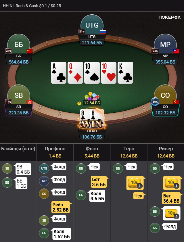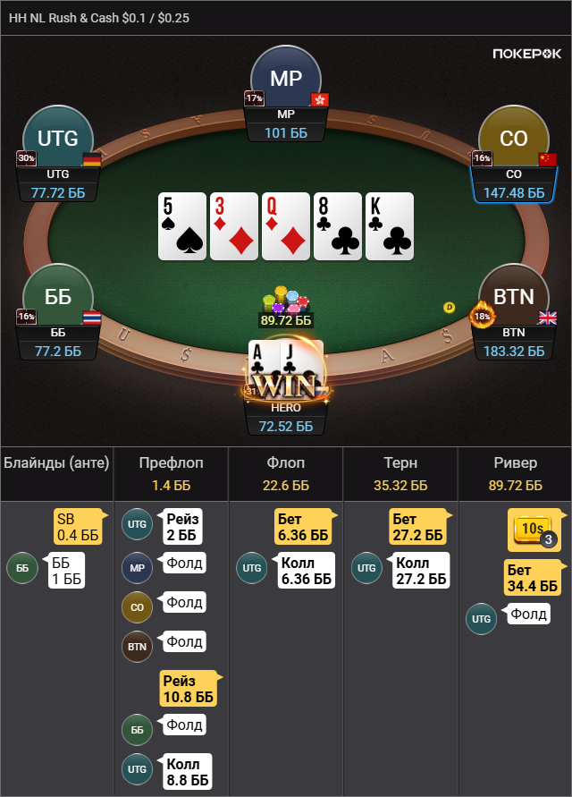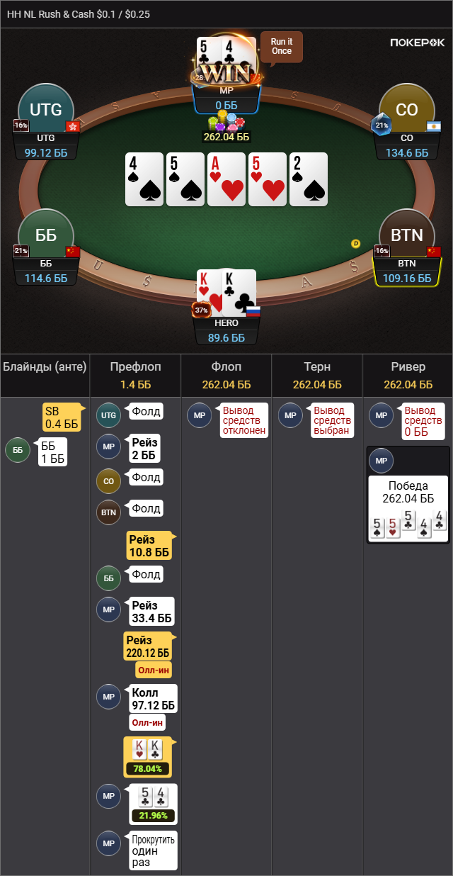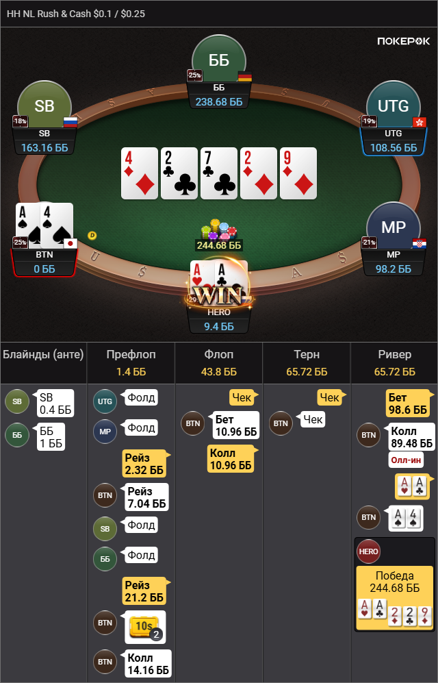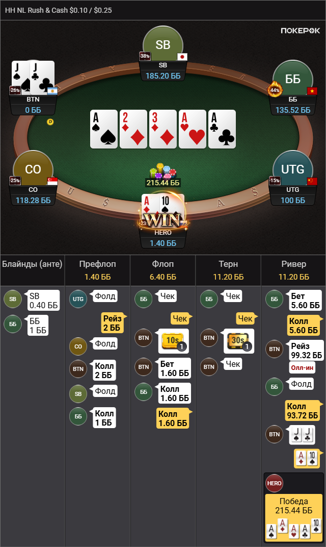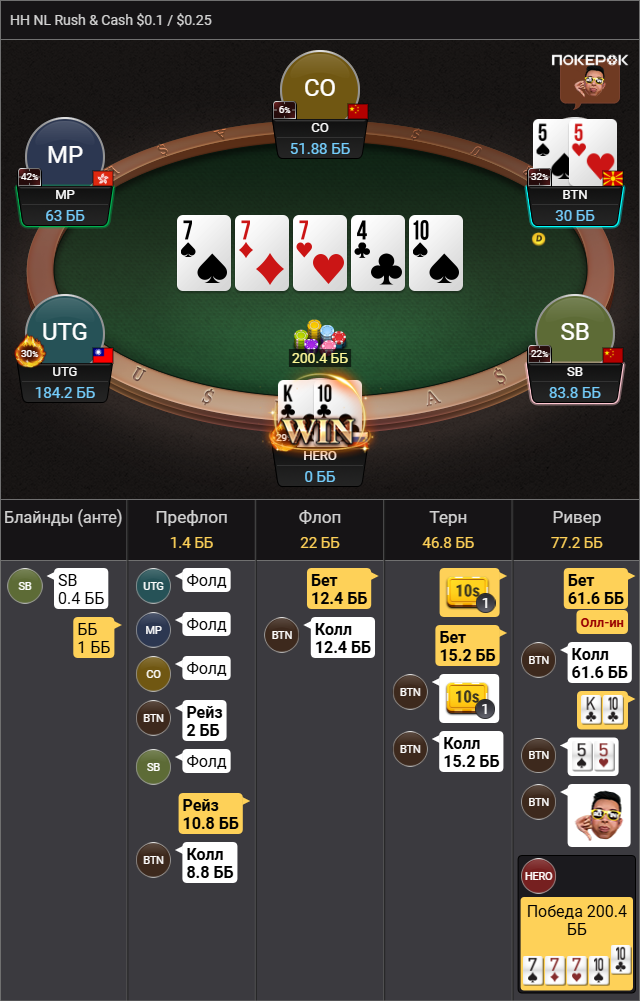 Выбивает все мои TT-KK, которые дают бедбит джекпот, проплачивает миллиард карет, ведь в мультипоте в колесо флопом я вполне могу ренжчекать и все тузы у меня будут. Браво маэстро.
