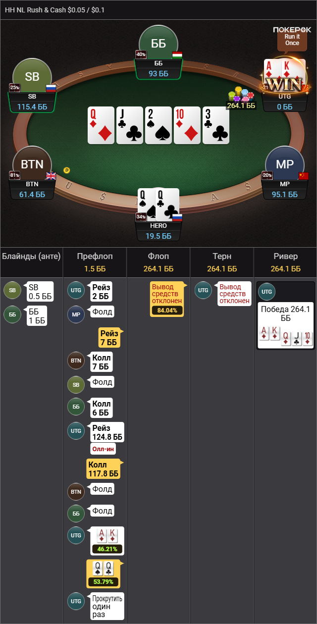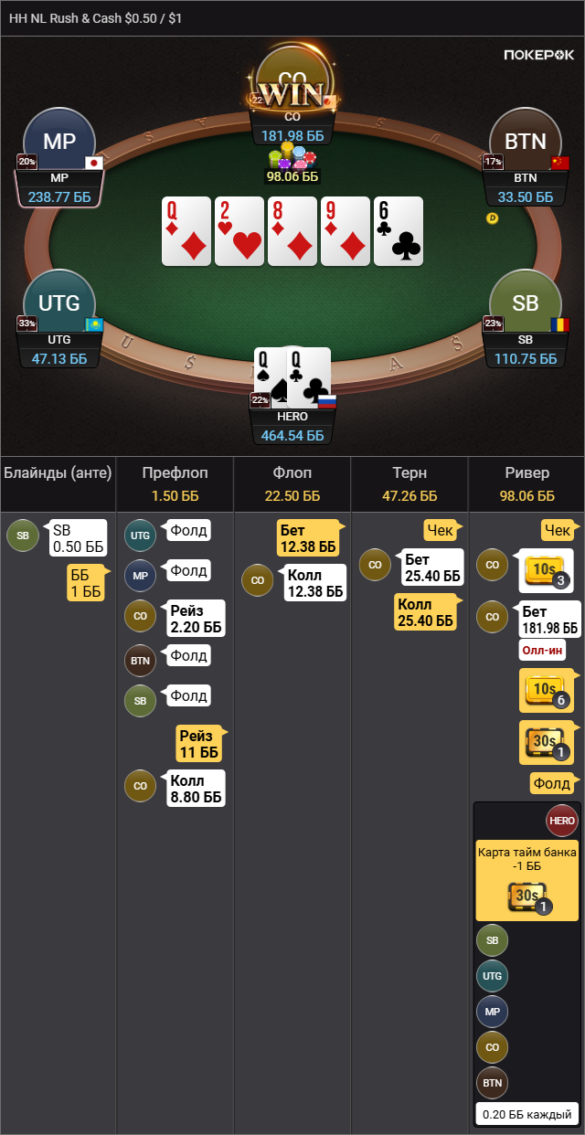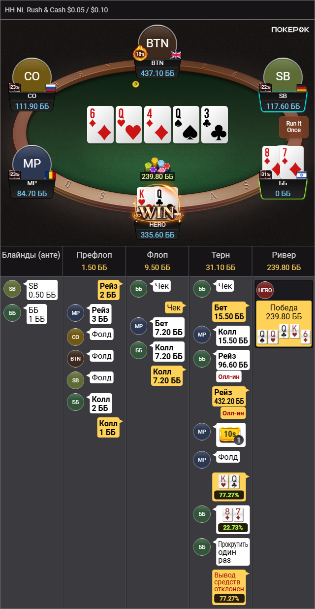 Сделал дальний проход в дешевой килополяне. Проебал с KQ в K9 бб вс сб. Следующей рукой 63с пихнул и вылетел. Хз вот последний пуш правильно или нет, типа мне 10 байинов дали - за первое чуть ли не 600. Вылетел 35м типа.