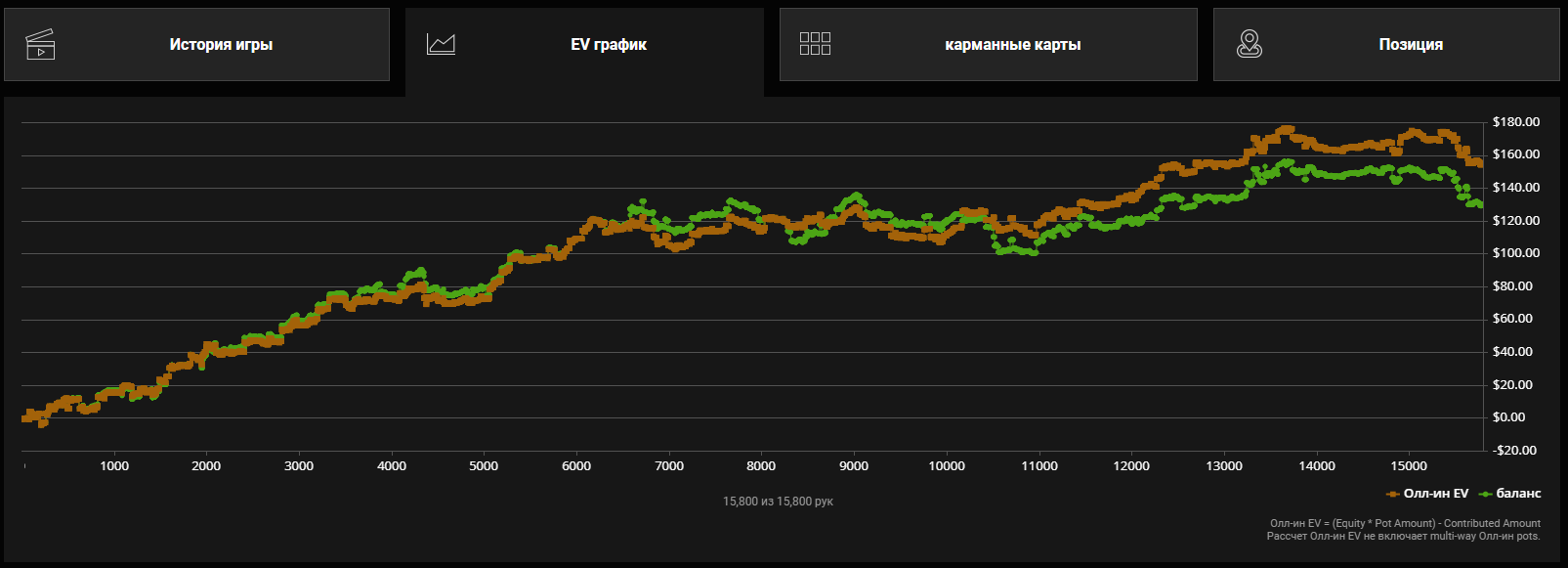 Уф. У меня оказывается был один из самых больших даунсвингов в этом месяце, а я и не знал... Всегда играю и не смотрю в кассу в течении месяца. А сейчас результаты подводил и вижу, что месяц в ноль вышел (хотя всего 20к рук сыграл). Открыл график, а там -20 стеков в начале было... а по ощущениям где-то в нуле болтался. Конечно немного сыграло, то что я после перерыва в 4 месяца начал играть и ошибки делал, но там и синяя вся в нуле, так что явно просто не пёрло. Хорошо хоть отпустило под конец, да и сам я наконец вкатился в ритм. Думал, если сыграл в нормальный плюс то добавлю себе NL200, но видимо ещё месяцок поиграю NL100.