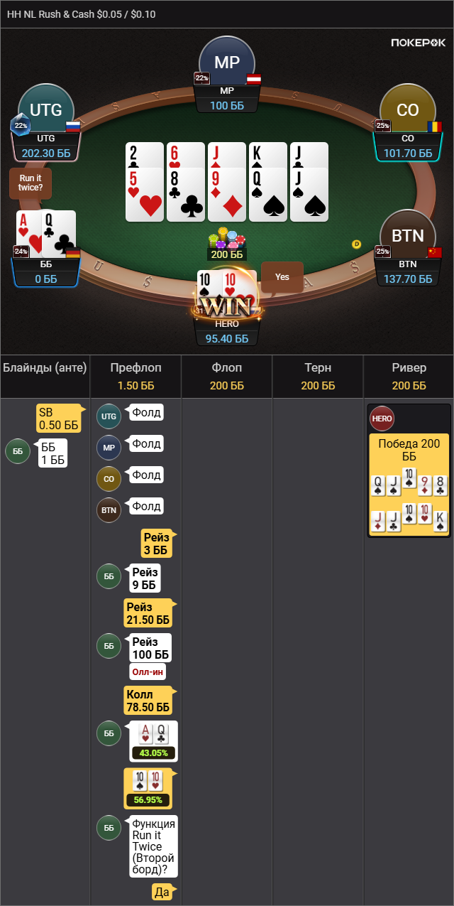 >>3227144 ? У тебя норм рука а перед тобой сплошные лимперы на 1 BB. Рейз до 8+ BB и с тобой в игре останутся только серьезные дяди, в твоих же интересах сократить число людей в игре чтобы повысить свои шансы на вин. Если все зассут, но тоже норм, ты спиздишь их бабки