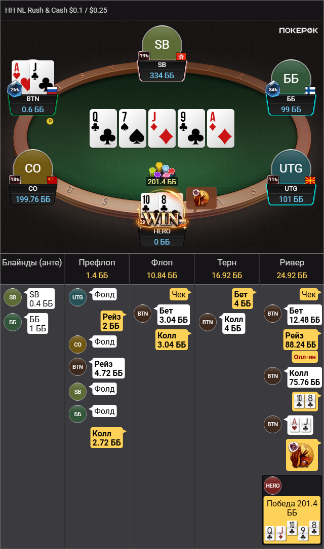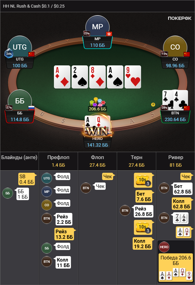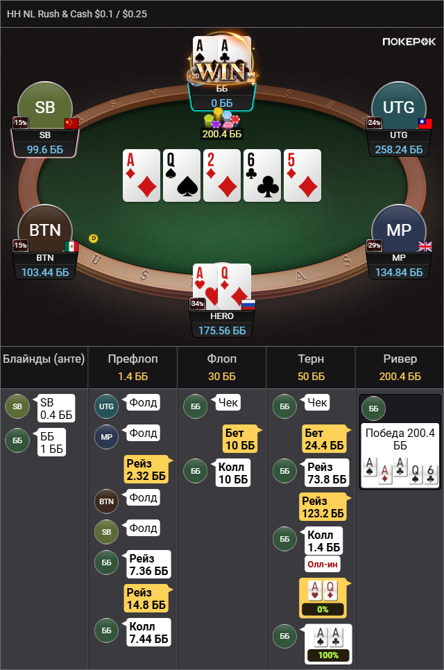 По AQs. У оппа фолд на сквиз 62% и 4бет на сквиз 10% всего. Если честно, я ему порезал почти всё тут. Какой-то узкий диапазон должен быть, состоящий в большинстве из QQ+,AK причём не все, скорее всего. Плюс какие-то блефы типа AQo,AJs,A5s. Исходя из его низкого фолда, у меня в сквизе не было коннекторов и средних карманок. Так что и у меня тут довольно узко всё. Вопрос тут скорее в том, с чем я тут вообще блефовать должен? У меня есть велью, но блефов тут полторы комбы. TT,AhQh,AsQs может немного 99. Какие из этих ком больше ФЭ имеют и достаточно ли его вообще? Я исходил из того, что я блочу оппу чек/коллы тёрна с AsAx и AsKs, а так же его AsKx часто блефовали бы тёрн сами. Вот и получается у меня вроде как одна из немногих рук, что блочит велью и почти не блочит фолды. Про сайзинг я тоже не совсем уверен был. Всё таки, если я поставлю 44bb (50%) у оппа к риверу будет всего 60bb в стеке, при банке в 170bb. Боялся, что он часто может просто пушнуть тёрн при таком раскладе или ФЭ ривера не будет.