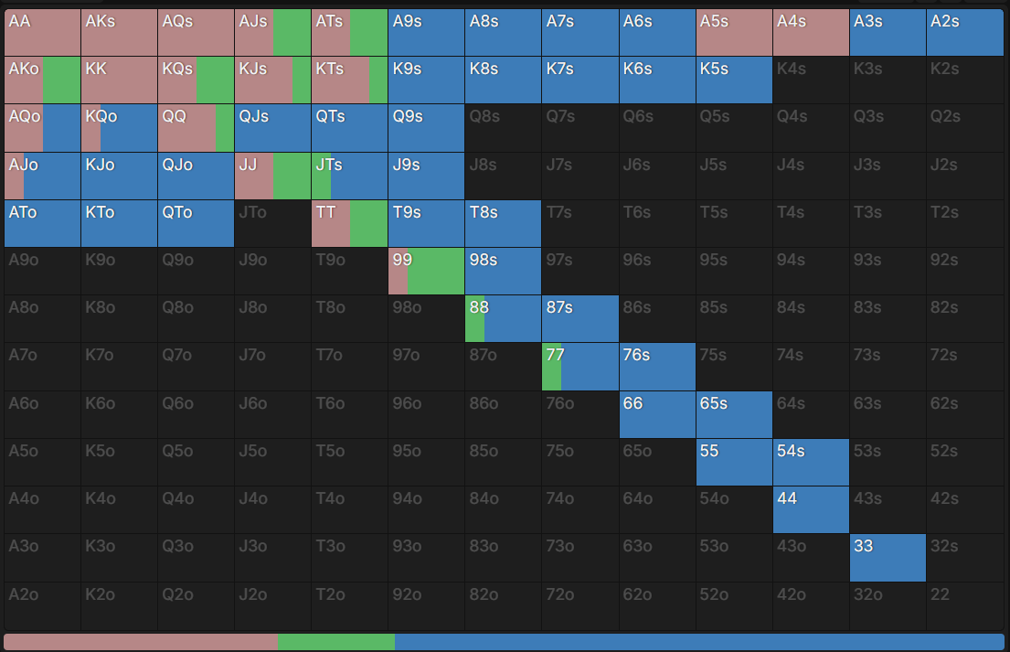>>3255066 У меня солвер с моими дефолтными диапазонами и если залочить уменьшенный чек/рейз флопа (как у поля), выдаёт такое решение. У оппа есть коллы слабее, но они все нулевые и не факт, что опп вообще способен их сделать. Да и с ними пуш всё равно хуже чека, кроме какой-то аномалии с блокерами...