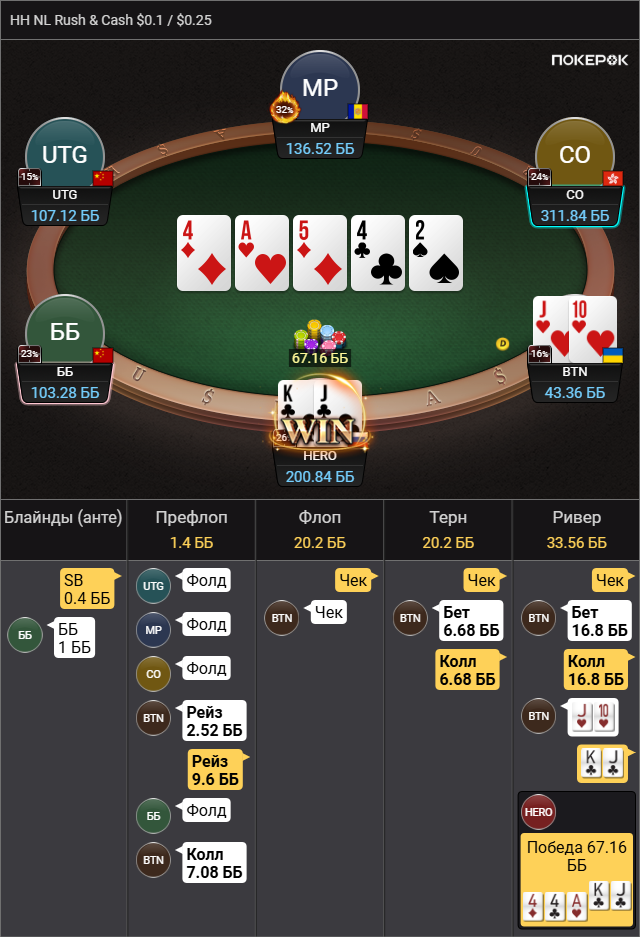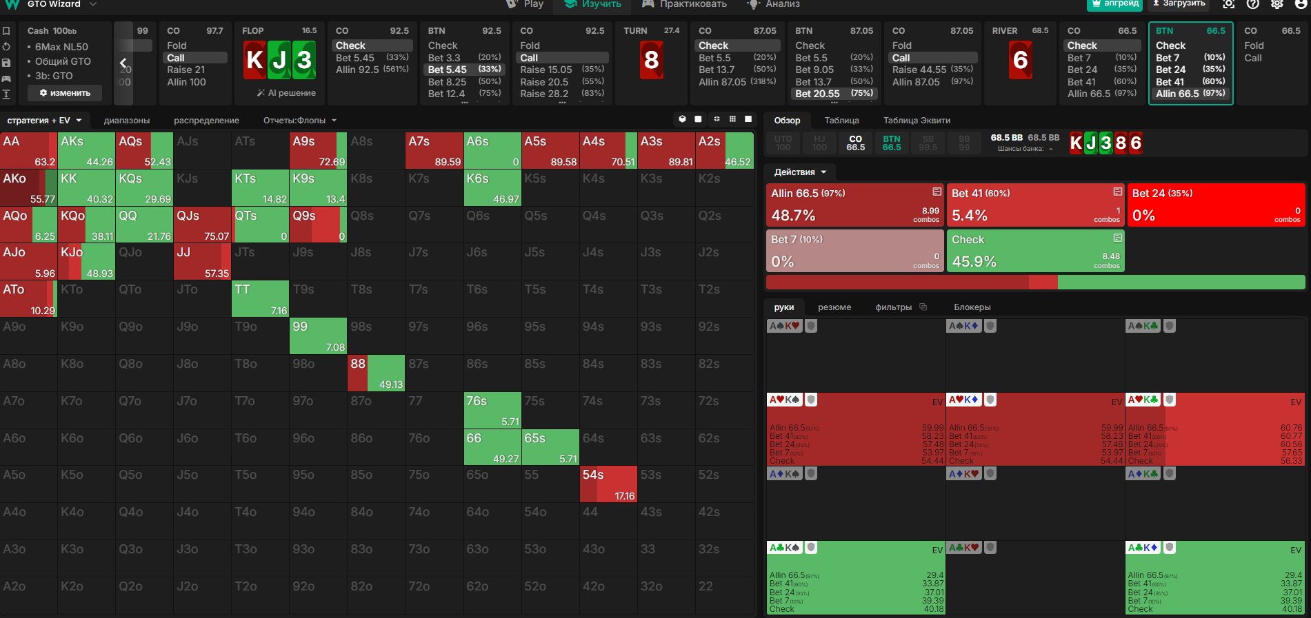Сейчас посмотрел в фильтрах свои коллы против 4бетов со нулевыми по ГТО руками (коннекторы, средние карманки, средний бродвей) за последние 150к рук. Получается, что я IP играю их в ноль, т.к. вообще супер. А вот OOP идёт в -800evBB/100. Полная беда... Хотя низкие коннекторы хорошо идут. Выходит мне или нужно фолд OOP увеличивать с 60% до каких-то эксплойтных значений. Или же, учиться играть 4бет поты агрессивно со средним велью, потому что я явно тащу пассивно и потом выкидываю на 2,3 баррели. Я когда-то ГТО смотрел, но там какая-то жесть с чек/пушами голых оверкарт... Мне кажется, будут не верить и вскрывать по AK постоянно. Из чего следует, что карманки слабые можно так пушить, наверное... что тоже в ГТО есть. У всех ещё и кбеты в 4бет потах под 100%, так что в теории идея неплохая.
