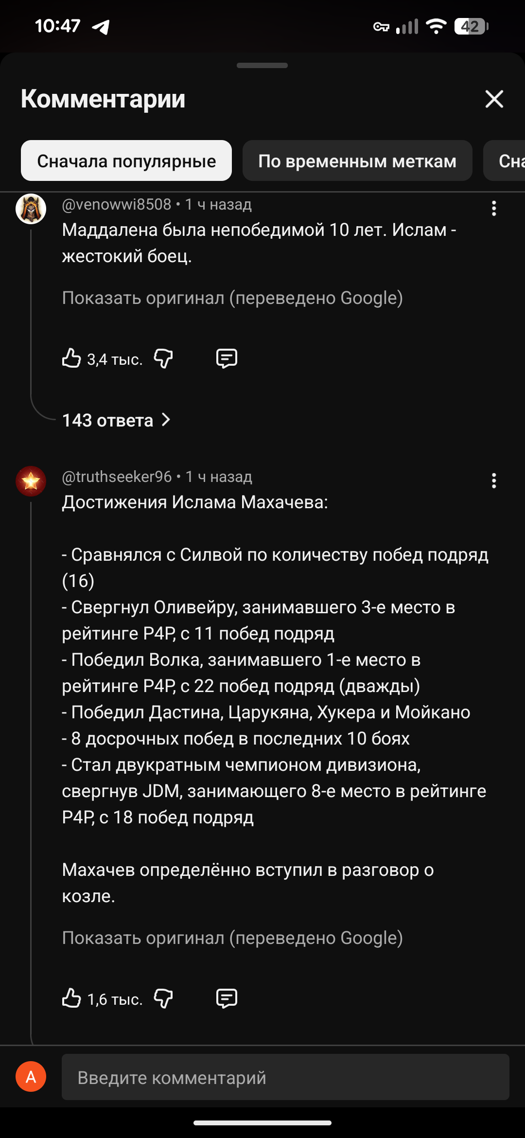 Почему только от русских читаю, что бой недостойный? Зайдите в англоязычный аккаунт в Инстаграме, или в Ютуб. Все хвалят Ислама, поздравляют. И только Ваньки в ВК или телеграмме пишут, что чемпион ненастоящий и что бой дерьмо. Найдите любой хайлайт матча на Ютубе, все комментарии восторг и поздравления. И только русские чем то недовольны. Он россиянин, всегда дрался под флагом России. Много гнили в вас, друзья. Зайдите так же после боя русского в любую группу про UFC в ВК и прочитайте комментарии. Другие нации всегда радовались за Яна, за Волкова. И только вы проявляете нацизм чистый