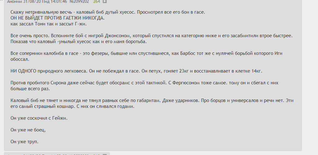 Как же меня задолбали эти сралетудопетухи, которые вечно приходят на турниры и начинают визжать про страх ударки, про нюхать жопу. Причем пишут одно и тоже годами. Как вообще это логически объяснить можно? Это же лютая шиза. Это смешанные единоборства, то есть где есть и борьба, и ударка. И ты говоришь бойцу типа не используй в бою борьбу. Что это за ебантизм? Они сами вдупляют что несут? Как сказать Перейре типа не используй левый хук, ничестно выходит.