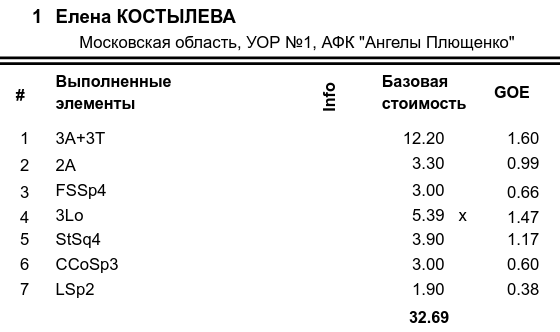 Софья Андреевна МУРАВЬЁВА Санкт-Петербург, СШОР "Звездный лед" 3z3t 3fq? с крошкой 2t 3r 3s обнимает себя во всех местах chsq1 3z ho 2a2t на минус 3f< 2a lsp3 stsq2 fall на попу