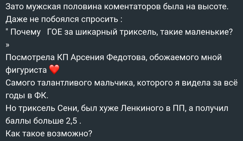 P.S.: Меня тоже мама в детстве пыталась тренировать и считала, что она больше Мишина всё знает, и только когда она полностью доверилась моему тренеру, только тогда я выиграл свой первый Чемпионат Мира. Паника из-за 2 места на Гран-при, зная, в какой ребенок травме - это как минимум странная реакция, тем более зная, что стоит за 1 местом в Москве и за 2 местом в Омске, тем более давая направо и налево всем СМИ интервью о травме Лены. ✍️Соцсети Евгения Плющенко