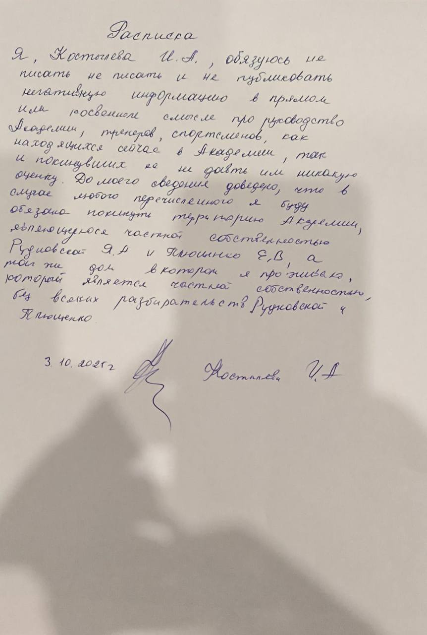 Маму-блогера неоднократно предупреждали о том, что на территории Академии необходимо соблюдать установленные там правила. О том, что нужно вести себя как минимум корректно по отношению к тем, на чьей территории живёт и учится её ребенок и она сама. Чуть больше месяца назад она даже собственноручную расписку написала. Но мама-блогер, как говорится, хозяин своего слова - слово дал, слово взял. В итоге она была удалена с тренировочной арены Академии по нескольким причинам: 1. За систематическое нарушение правопорядка (мат и оскорбления - в адрес тренеров, спортсменов и их родителей). 2. За жестокое обращение с собственным ребенком (Леной) в раздевалке и на территории Академии. С применением физической силы к хрупкой девочке! Есть доказательные видео-материалы с камер и показания свидетелей, включая видео -записи тренеров, персонал и родителей. Мама-блогер уже состоит на учёте в органах опеки по этому вопросу. Все доказательства нами были собраны и переданы во все соотвествующие органы, включая Уполномоченного при Президенте Российской Федерации по правам ребёнка - Марии Львовой -Беловой, а также в ФФККР. Боюсь даже представить, какой шок испытает общественность, увидев эти материалы. Маму-блогера вытаскивали из полиции, раз за разом предоставляя маме-блогеру шансы прийти в себя. Давали за неё поручительство опеке! Шансов было, наверное, слишком много. И их тоже не оценили. 3. За выбегание на лёд с ценными «дилетантскими» указаниями. 4. За съемку наших несовершеннолетних спортсменов из кафе и за выкладывание рассказов про их тренировки в инфо-поле для развития своего очередного блогерского канала. Мама-блогер прекрасно знает, что съемка детей на территории Академии запрещена. Но разве какие-то правила её остановят? Именно из-за неё на окно кафе, выходящее на лёд, были смонтированы жалюзи. Чтобы хоть как-то оградить наших спортсменов от несанкционированеых съёмок. Сейчас они открыты. 5. За оскорбление, мат и угрозы в отношении нашего сына и других детей Академии. И всё это в присутствии свидетелей! 6. За систематическую ложь про наш штаб и меня лично в своих каналах. Так и живем уже 2 сезона подряд с олимпийским спокойствием и давая маме -блогеру шанс за шансом!