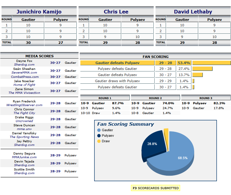 Пимблет лох, но всё равно бой красивый получился. Омелли очевидно было. Акоста очевидно было. Наташа с привкусом булшита, но ок. Силва - мальчик треда. Умар очевидно было. Готье разочаровал вообще. Пуляев его гонял как собаку, но нокдауны зарешали. Перез молодец. Джош Хокит норм, но всё равно он мешок. На мешке норм отработал. Миллер норм, но всё равно бомж.