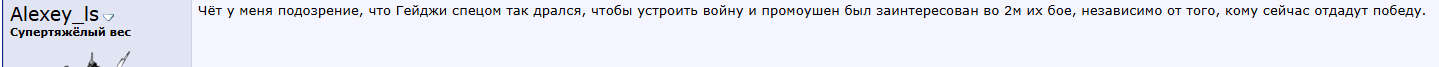 Хочу увидеть бой Бенуа Сен Дени с Пимблетом или с Физиевым, ух бля как хочу. Мне кажется труп Хукера отдадут Пимблету при любом раскладе: Победит БСД - СМОТРИТЕ, ХУКЕР ЕЩЕ МОЖЕТ, ВОТ ПРОВЕРКА ПИМБЛЕТУ! Проиграет БСД - ну так, бой, чисто чтобы вернуть Пимблета на победную серию