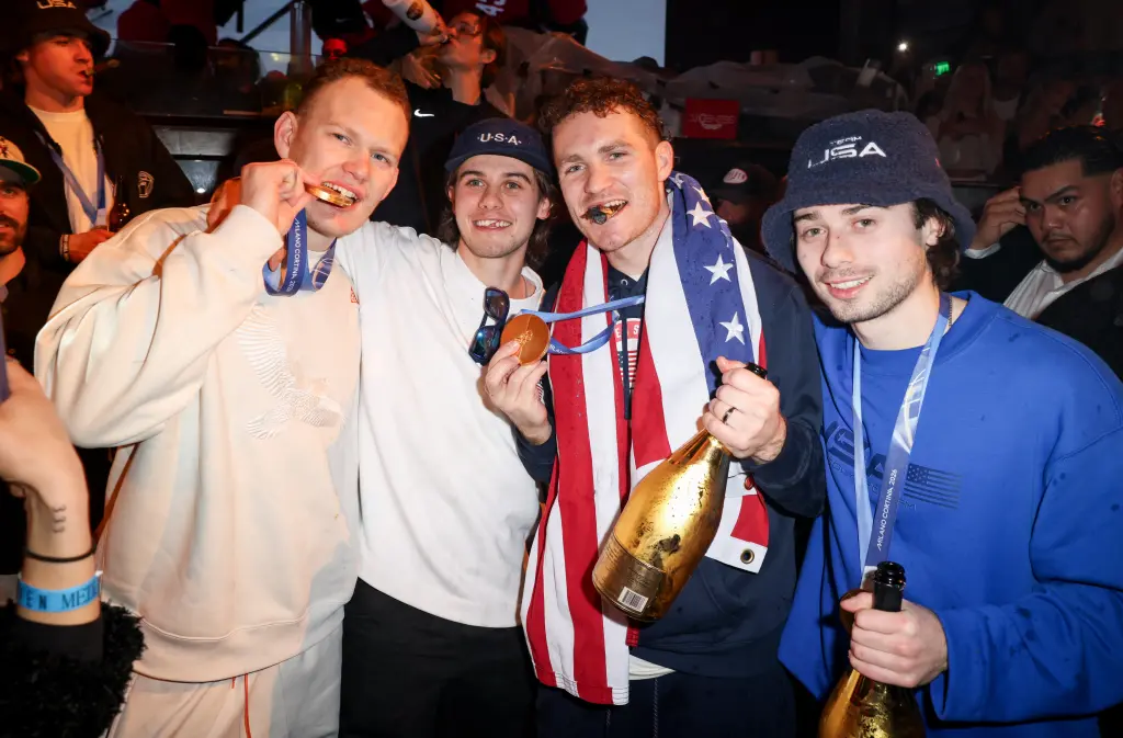 Джек Хьюз освистан на полупустой арене в Нью Джерси во время своей речи. Болельщики развернули большой радужный флаг в поддержку женской команды и скандировали CHINA CHINA CHINA.
