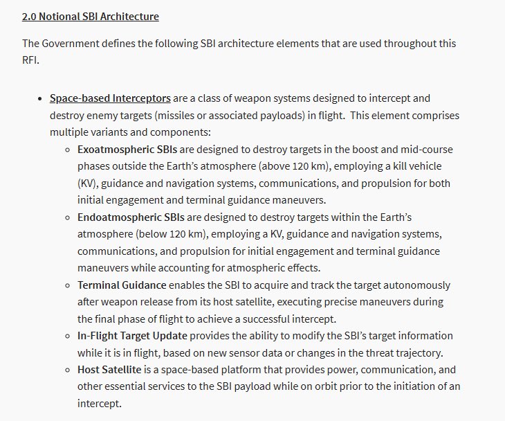В июне 2025 года Исполнительный офис программы «Космическая боевая мощь» Космических сил США направил в промышленность запрос на предоставление информации «для определения существующих возможностей космической противоракетной обороны и разработки стратегии по архитектуре расширенной группировки космических перехватчиков, способной осуществлять перехват на активном участке траектории, среднем участке траектории и участке планирования».