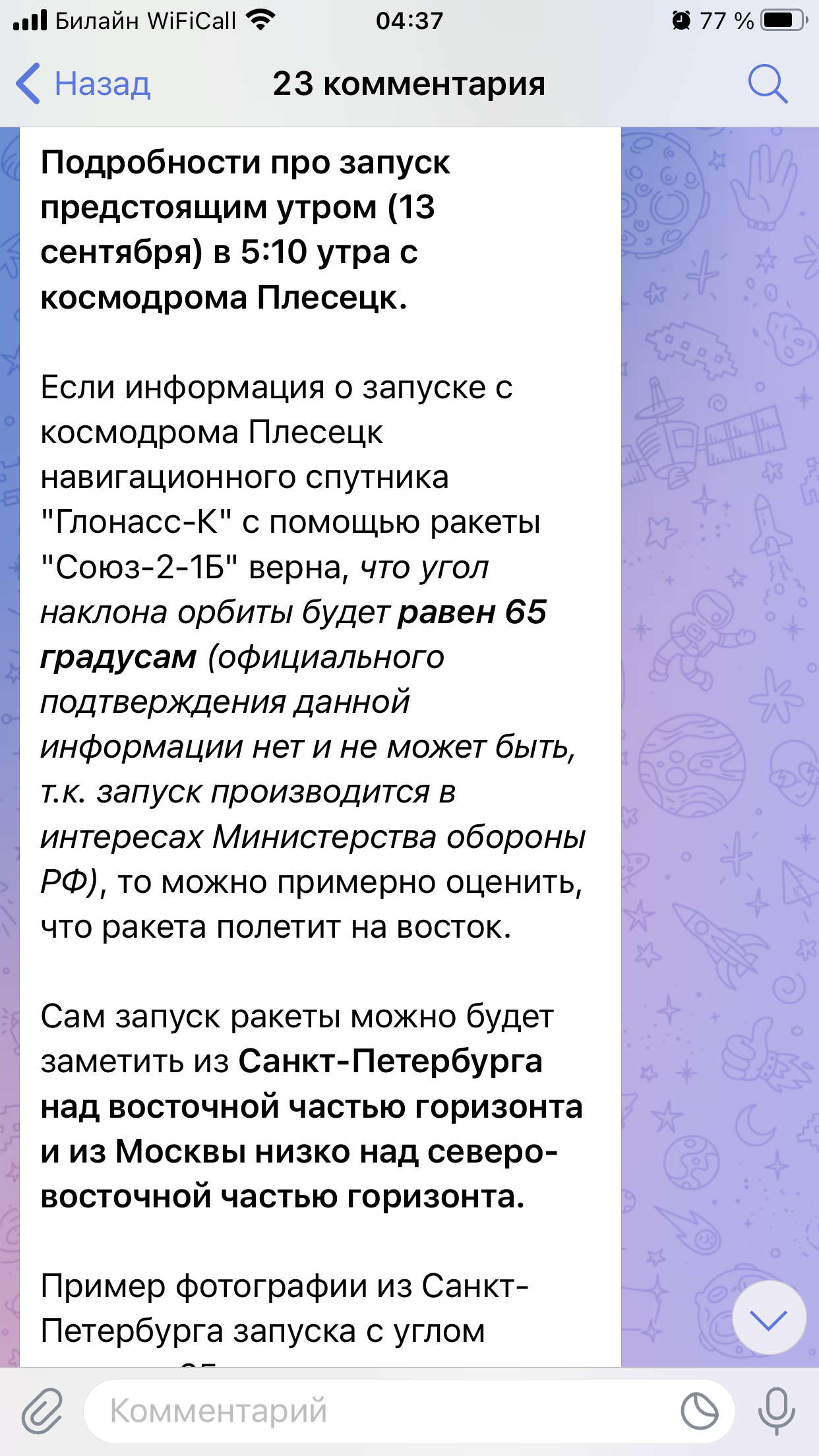 Ну чо посоны, через полчаса запуск с Плесецка, котлрый я надеюсь увидеть из Ярославля (566 км расстояние до Плесецка). Впервые в жизни увидеть своими глазами запуск ракеты