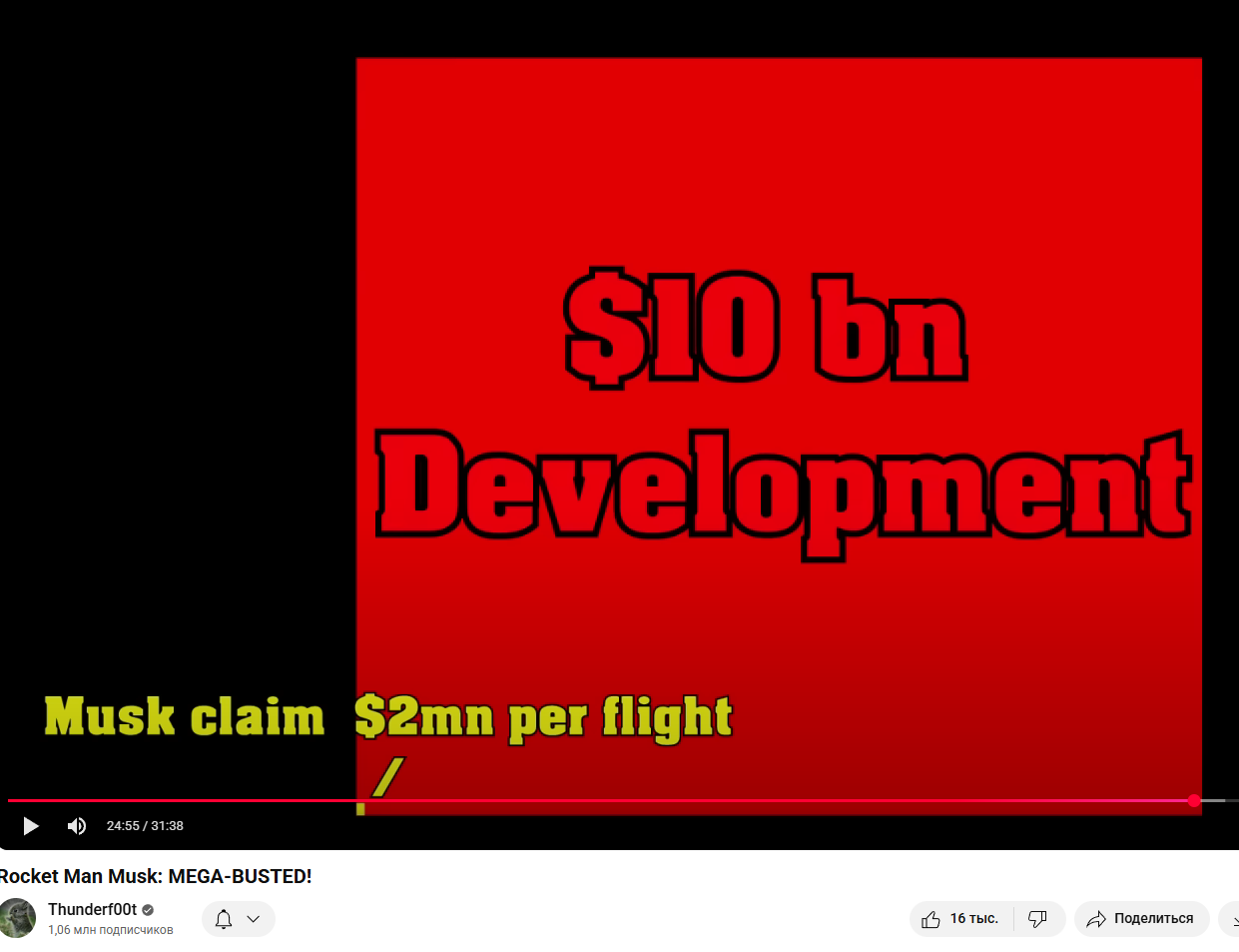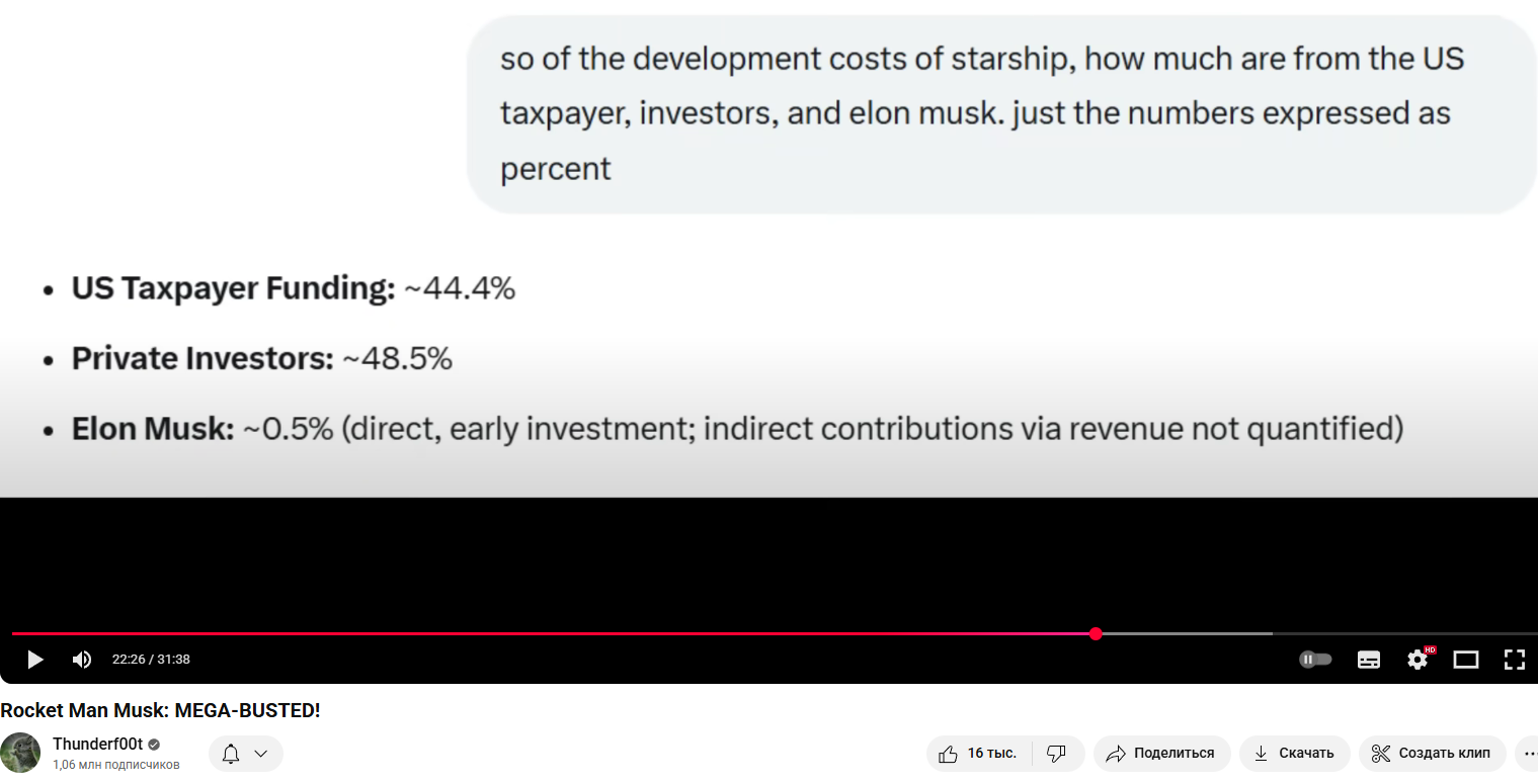 Я просто напомню, что делал Сатурн на своем 11ом полете >Ряяя было бы у свитого Илония такой бюджет, как у Аппалона он бы уже всех людей на планете на Марс и обратно бесплатно покатал Во-первых, бюджет Аполлона это не только ракета, а еще куча всего типа роверов, обучения астронавтов. Во-вторых, Илошиных пол триллиона хватило бы на весь Аполлон.