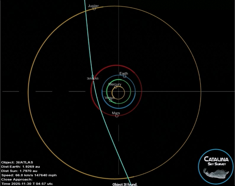 Общая информация о комете: Комета 3I/ATLAS — это третий известный объект, прибывший из-за пределов нашей Солнечной системы и обнаруженный при прохождении через наше космическое окружение. Орбита — ретроградная (движение в обратном направлении по сравнению с планетами) и почти «вровень» с плоскостью Солнечной системы, отклоняясь лишь на ~4,9° от неё. Вероятность такой траектории пролета составляет 1,361%. Приближение к Марсу: примерно 29 миллионов километров (0,194 а.е.). Приближение к Юпитеру: примерно 53,56 миллионов километров (0,358 а.е.). Максимальное приближение к Солнцу (перигелий) ожидается ~30 октября 2025 г., на расстоянии ~1,36–1,4 а.е.. Ядро кометы по оценкам имеет диаметр в широком диапазоне (от сотен метров до нескольких километров), но многие оценки склоняются к верхним границам.