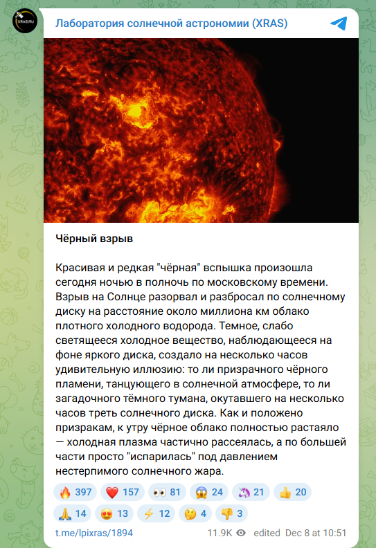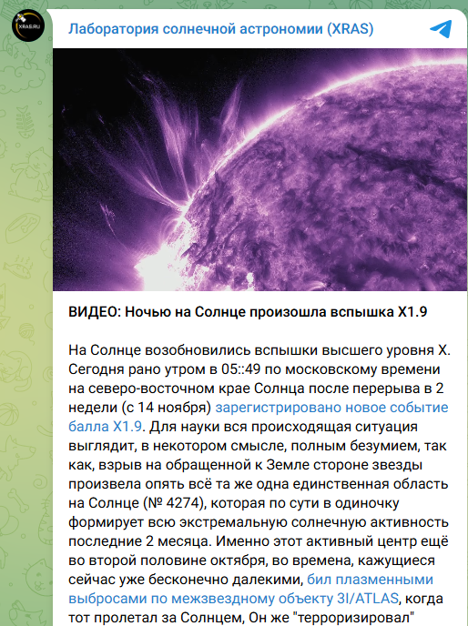 Лаборатория солнечной астрономии ИКИ РАН в своем телеграм-канале. https://t.me/lpixras/1870 Новое событие балла X1.9, зарегистрировано 1 декабря в 05:49 мск после двухнедельного перерыва. Его произвела уже известная нам активная область, вышедшая с невидимой стороны звезды на северо-восточный край. «Для науки вся происходящая ситуация выглядит в некотором смысле полным безумием, так как взрыв на обращенной к Земле стороне звезды произвела опять всё та же одна-единственная область на Солнце (№4274), которая по сути в одиночку формирует всю экстремальную солнечную активность последние 2 месяца», — объясняет лаборатория. Этот же активный центр обстреливал плазмой межзвездный объект 3I/ATLAS и нашу планету: произвел сразу пять вспышек высшего уровня X после полугодового затишья, в том числе две крупнейшие за год (X5.1 от 11 ноября и X4.0 от 14 ноября). Во второй половине ноября этот центр ушел за правый западный горизонт Солнца.