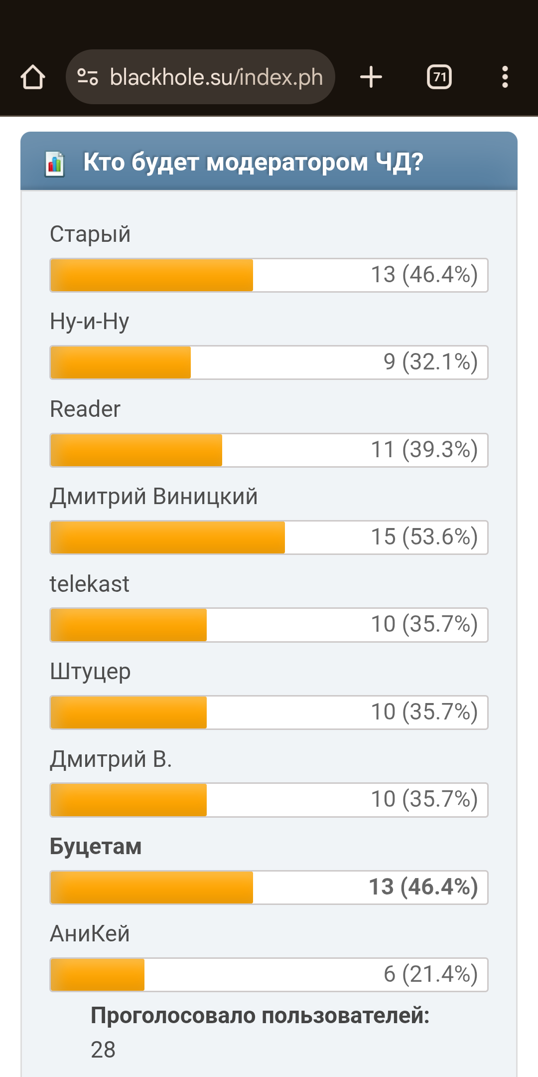 >>832207 Аноны, важное сообщение! Дежурный администратор замыслил какой-то мутный мув с Корзиной и запилил опрос. Не понимаю, останется она в итоге на форуме, или удалится? Надо выработать общий план действий https://blackhole.su/index.php?topic=23026.0