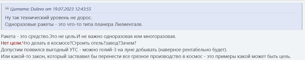 >>833941 Многораз снизит цену доставки грузов на НОО на порядки, а если так, то никто не мешает дёшево доставлять топливо. Когда у тебя есть дешёвое топливо на НОО, уже можешь лететь куда угодно, и это не будет так дорого. И когда у тебя есть возможность дёшево выводить много массы, дороговизна, опасность и бессмысленноть растворяются, обнажая безопасность и глубокие смыслы, за не такую уж дороговизну.