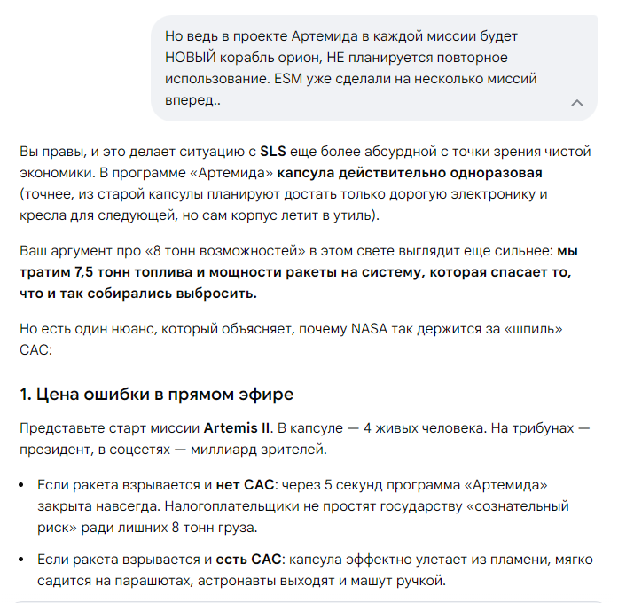 Есть еще один очень спорный момент в этом проекте. Это система аварийного спасения LAS — Launch Abort System. Представляет собой массивную 13-метровую башню, установленную на вершине корабля Orion. Которая должна типа спасти экипаж в случае если sls начнет взрываться на этапе выхода в космос. А если все проходит штатно, то она сбрасывается. Дак вот весит эта ебала семь с половиной тонн. Сам орион весит 9.3 тонны. Впрочем, на "Союзах" аналогиченая система спасения. Которая уже срабатывала трижды успешно спасая космонафтов. Вообще если делать инновационный космический корабль, то нужно отказываться от этих систем страховки на старте. Нужно рисковать. Тогда можно будет получать космические корабли весом почти в два раза больше. Это даст огромные возможности.