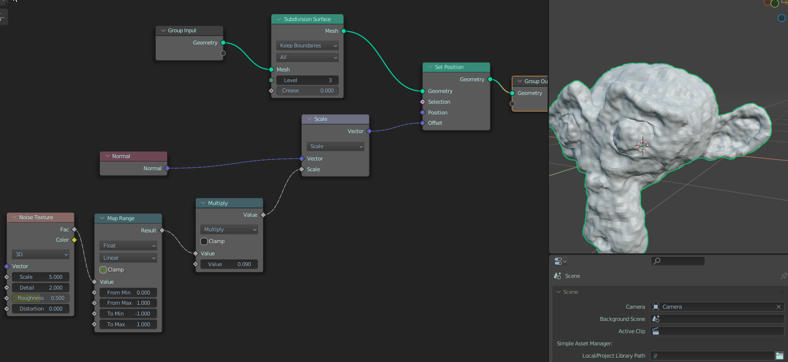 >>293956 Если не понятно, то взято направление нормали и вдоль него идёт оффсет, тупо нормаль множится на число от нойза. Короч вершинка гоу брр вдоль синей палки
