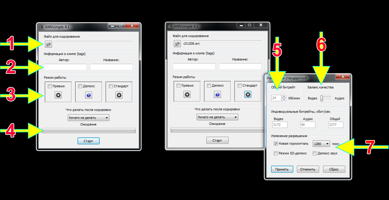 >>318222 Я не знаю что такое "ИК". Если расскажешь может смогу ответить. >>318243 Зависти от модели. Посмотри в морфах. На разных моделях по разному. >>318272 >Про гуй интересно, расскажи какой используешь. Я использую Симплу (AMVsimple GUI) Пик 2. Утилита простая но очень многое умеет. Подробней пик 2. Стрелка 1 - Кнопка выбора AVI видеофайла для кодирования. Стрелка 2 - Окна для вписывания инфы которая будет сохранятся в метаданных видео. Стрелка 3 - Выбор варианта кодирования. Вариант "Превью" тебе вряд ли когда то пригодится. Вариант "Делюкс" - кодирование с дефолтными параметрами. Вариант "Стандарт" - кодирование с настраиваемыми параметрами. Стрелка 4 - Индикатор прогресса кодирования.