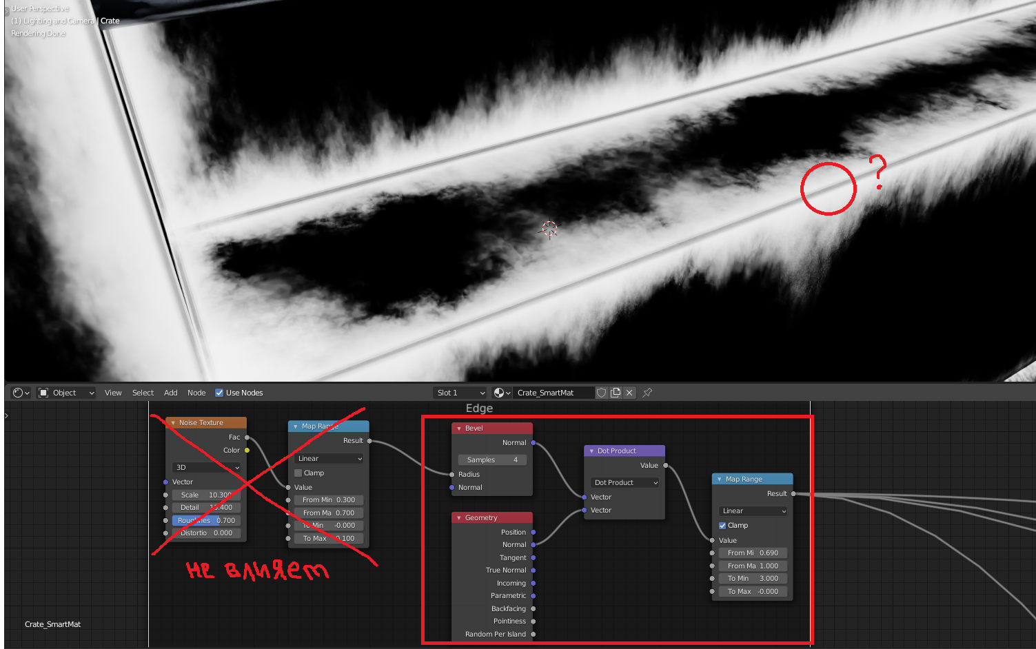 >>323700 Нет, это не сглаживание. Вот, залил файл на обменник, можешь сам взглянуть: https://www.mediafire.com/file/srm7kxholq2lid3/Crate_problem.blend/file Модель не моя, если что, а чедовская с туториала. Там ещё +100500 нод было, к проблеме не относящихся - я их удалил, дабы не мешали. Сейчас там только маска для выделения граней. Если у тебя другая версия blender - можно будет как раз проверить, связано ли это с моей 2.92.