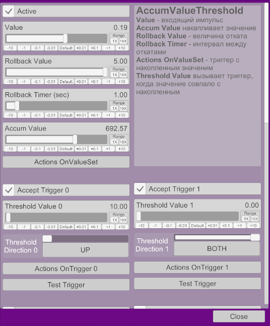 Короче. Вроде довёл до ума свой плагин AccumValueThreshold и пару сцен на его основе в качестве демонстрации https://mega.nz/folder/Wo1iXKRS#4rQM3FMavnVhJ1iVGi5Hag В сцене используется много чего ещё. Откройте сцену в пакаге-манагере и просканируйте её на недостающие у вас объекты