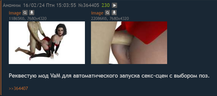 Набросал сцену со своим плагином. Собирал заново на новой копии vam. С новым подходом. Тут получилась полная автономность персов. Только кнопка снаружи запускает движение. Не знаю, как это можно автономно запускать из перса. Собрал в архиве со сценой все плагины, которые использовал. Это самый минимум. Только для демонстрации этой автономности https://mega.nz/file/blFjzIQJ#i4QIuDIxou6EfQRw-bZyC-DhZZVQUQ1sz7R7CK4miDE Автономность, как по видео видно вот в чём: - бой при приближении к своему оргазму ускоряется на 10 секунд. - когда происходит сам оргазм - останавливается. так же и с гёрлой. даёт ей время - после оргазма у него откат до нуля возбуждения - у гёрлы до 70% - возбуждение выражается в блеске кожи, топорщении сосков, эрекции. Это у обоих