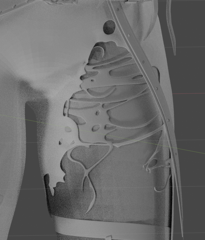 Вот навозюкал своими кривульками текстурку прозрачности, но результат неудовлетворительный, умел бы рисовать - в блендер бы не полез. Вариант с динмаик пеинтом всё ещё лучший, но если герерировать картинку шире чем 256 пикселей - компутер виснет. А надо минимум 1024