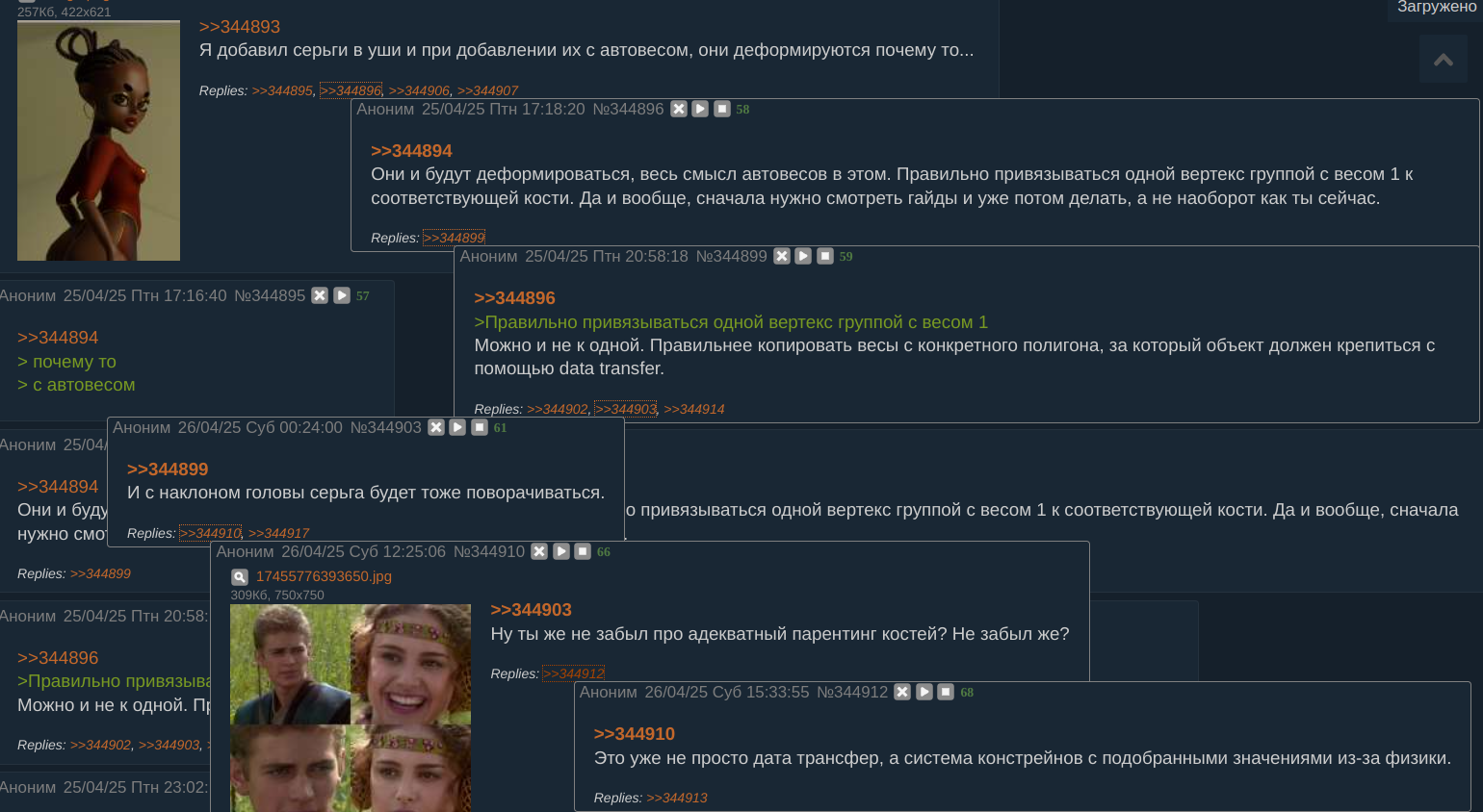 >Чел ригает, значит, предполагается анимация, а с ней и физика. Так можно что угодно за уши притянуть. Курс по риггингу текстом не хошь? А чё не так то, раз ригать то вот ответ как ригать, курс. Вопрос был как нарисовать веса на earring так чтобы они не гнулись, напомню. И мой ответ был такой же, без приплетания физики и прочей погоды на марсе хуй пойми зачем.