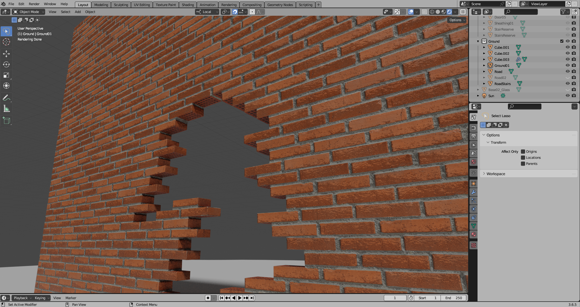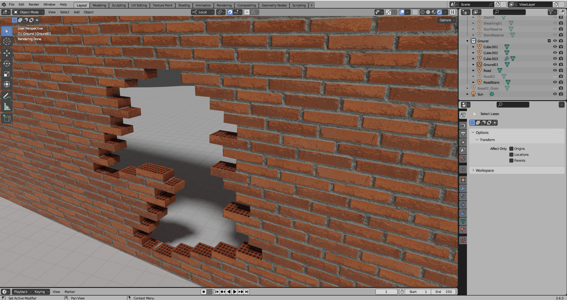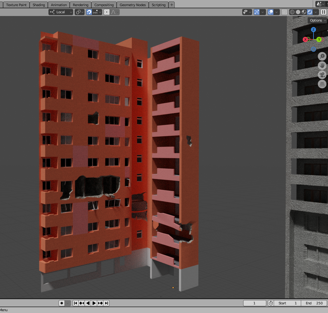 И пытайся реализовать хотя бы в меру способностей. Не надо там глубочайший скульпт пиздец. Даже если у тебя несколько кирпичей будут просто плоскостью под разными углами срезаны и раствор в дырках — уже хорошо. Микрорандом по повороту кирпича — тоже. У тебя же есть рандом по цвету и смотрится это вполне. То есть сама поверхность правдоподобна. А пролом жесть.