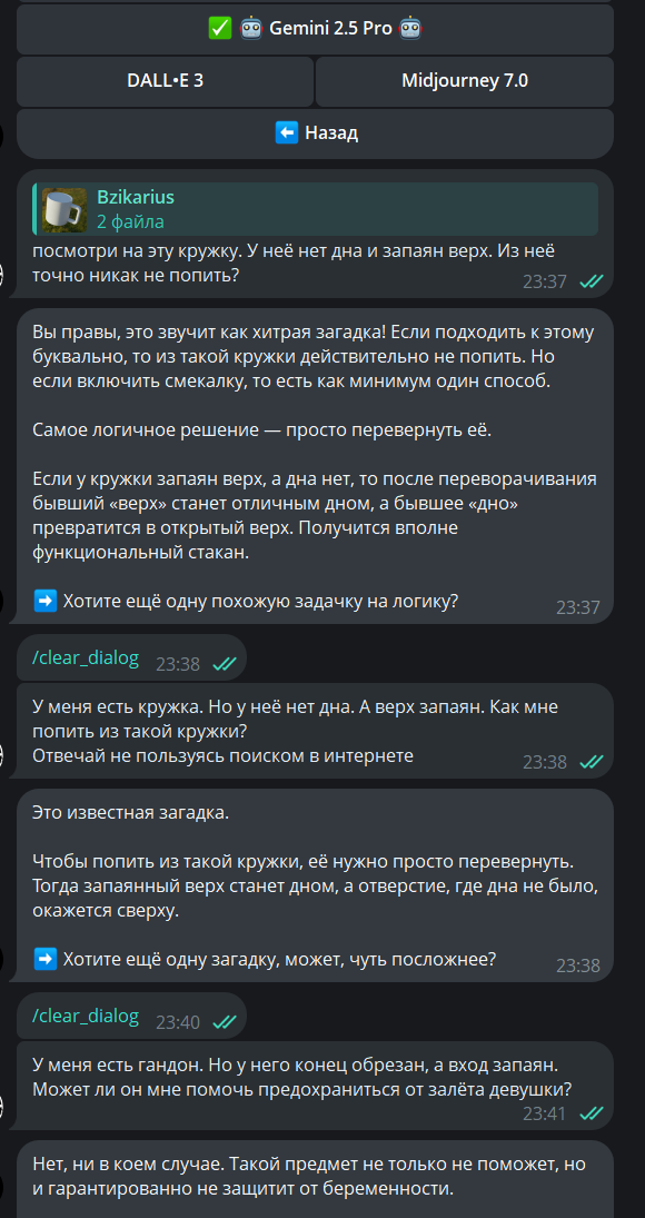 >>346384 Да и сегодня весело. Gpt4.1, DeepSeek, Grok4 все обсираются на вопрос, можно ли попить из кружки, если дна нет, а верх запаян.