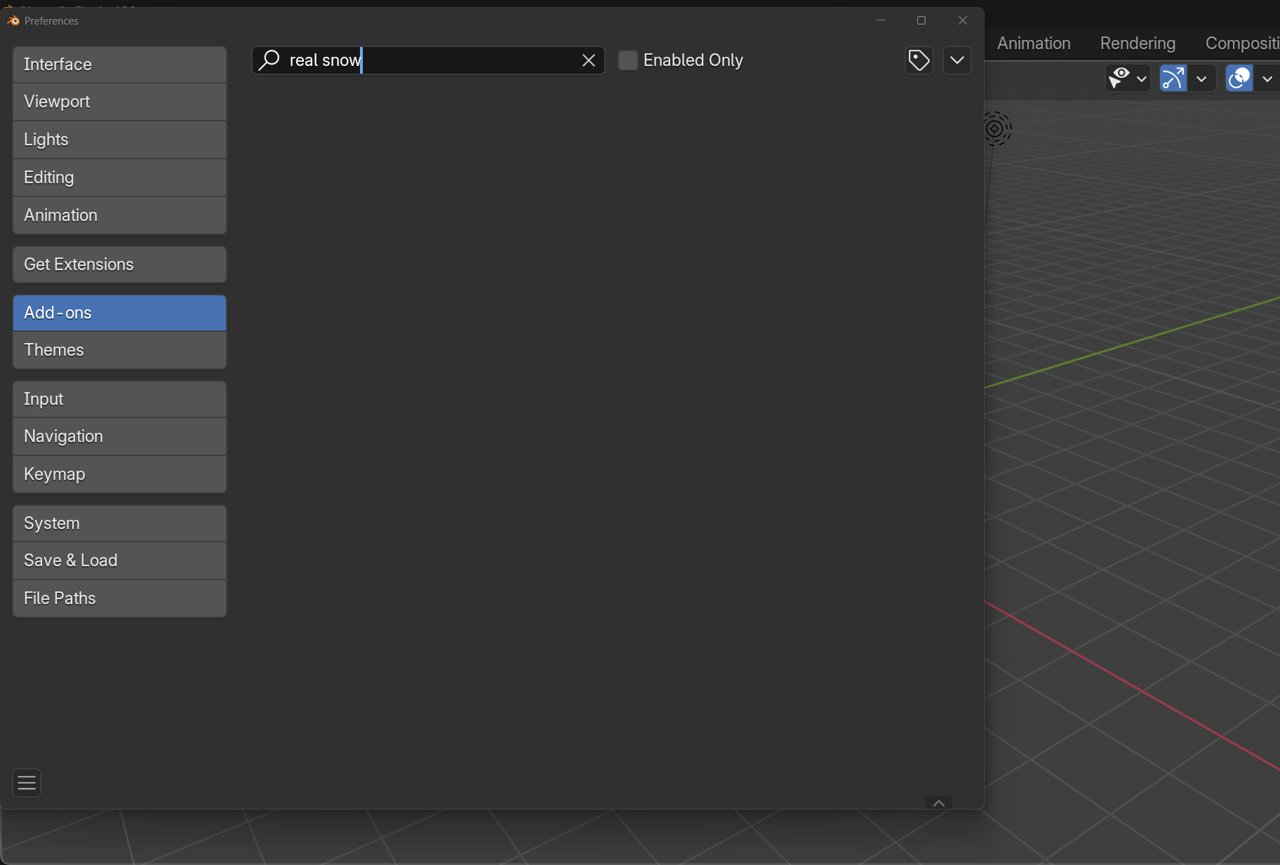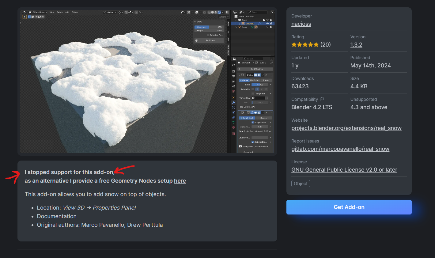 >>346450 А понятно. Ну смотри, этот Real Snow - в экстеншонах был, а не в аддонах. Это первое, второе - разработчик перестал его поддерживать. Ты можешь скачать сетап геонод, либо экстеншон со страницы