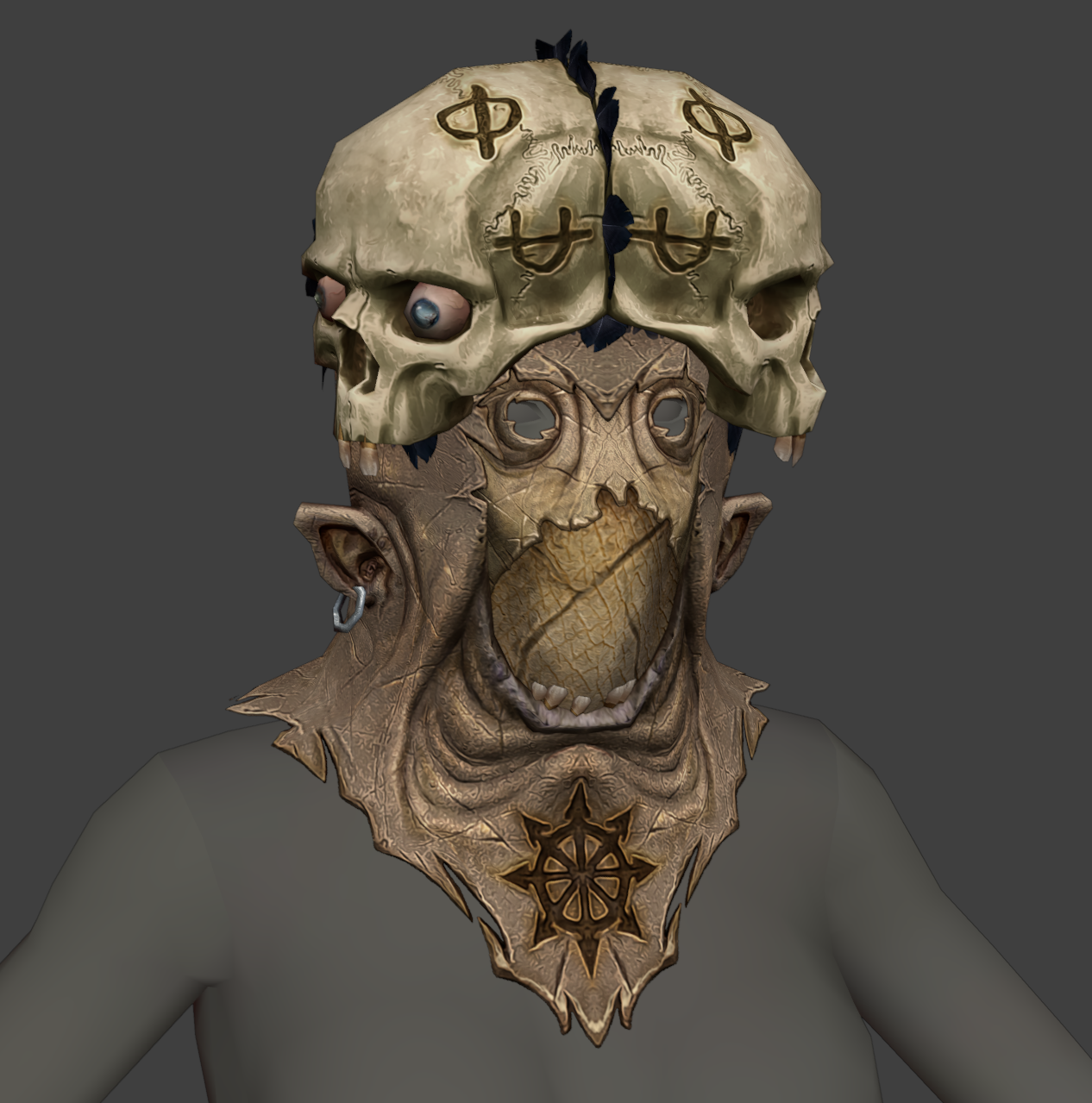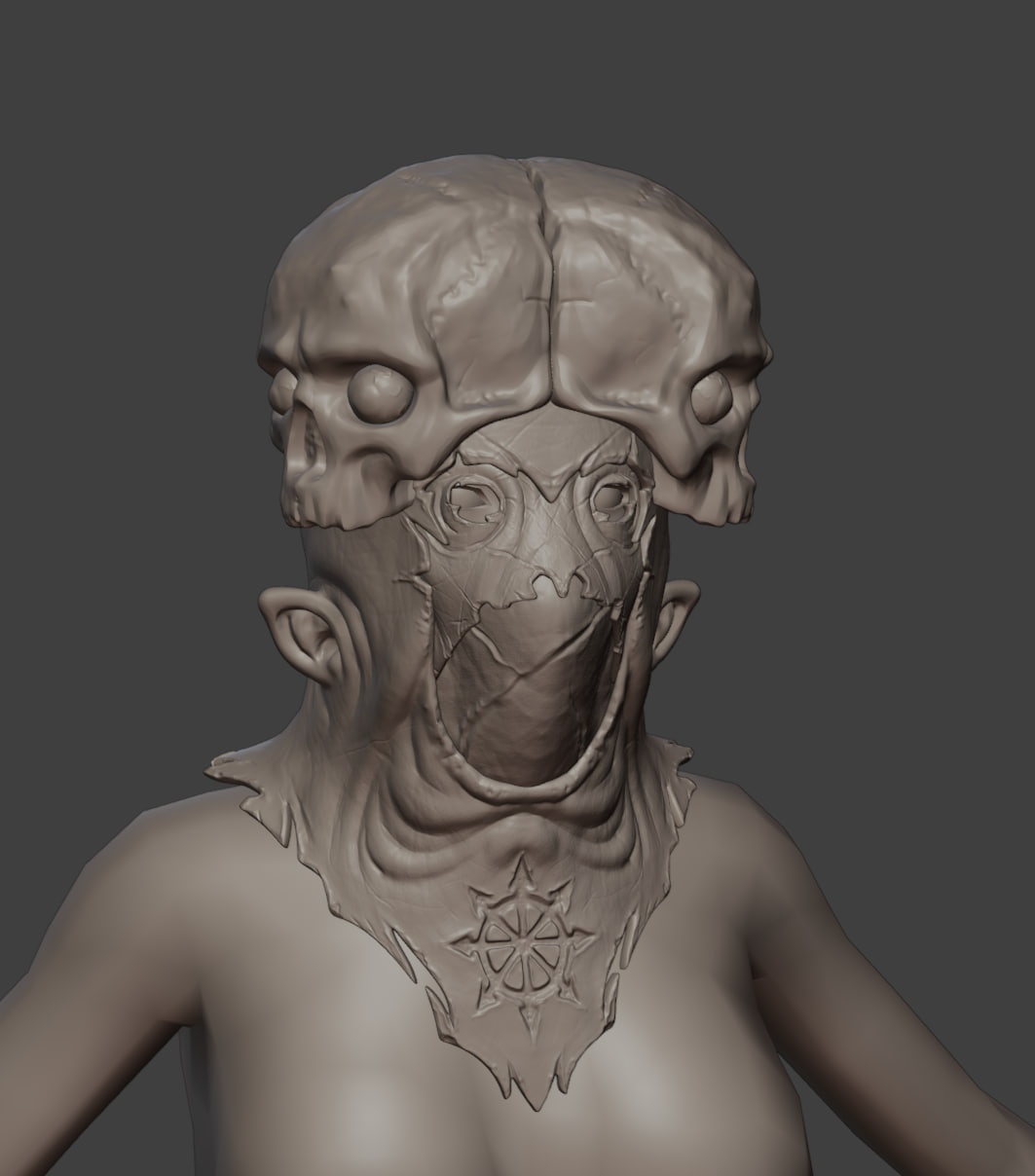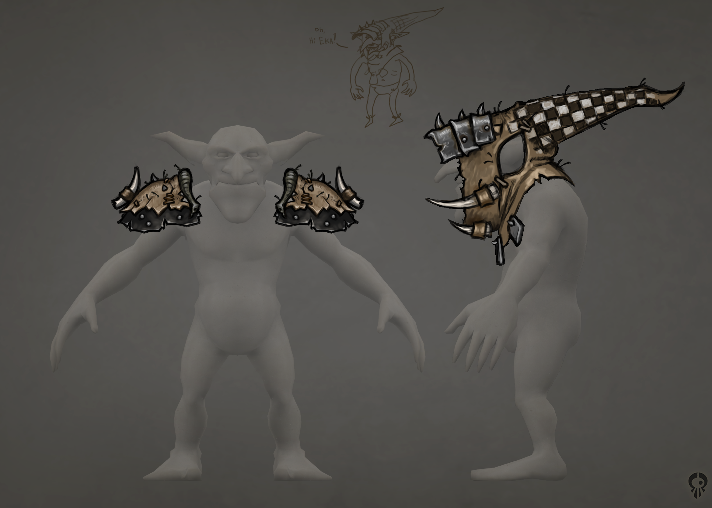 В итоге первое, что было сделано — коллаж из нейросрани, определились какие будут руки, ступни, глаза, рот, нос (с какой из генераций что брать). Как вообще должны втыкаться конечности в персонажа, чтобы он потом мог полноценно двигаться и ходить (посоветовались с аниматором). Потом эскиз поверх всего. Потом нормальное 3д. (снова консультация с аниматором, где добавить топологии для движения и шейпкеев).